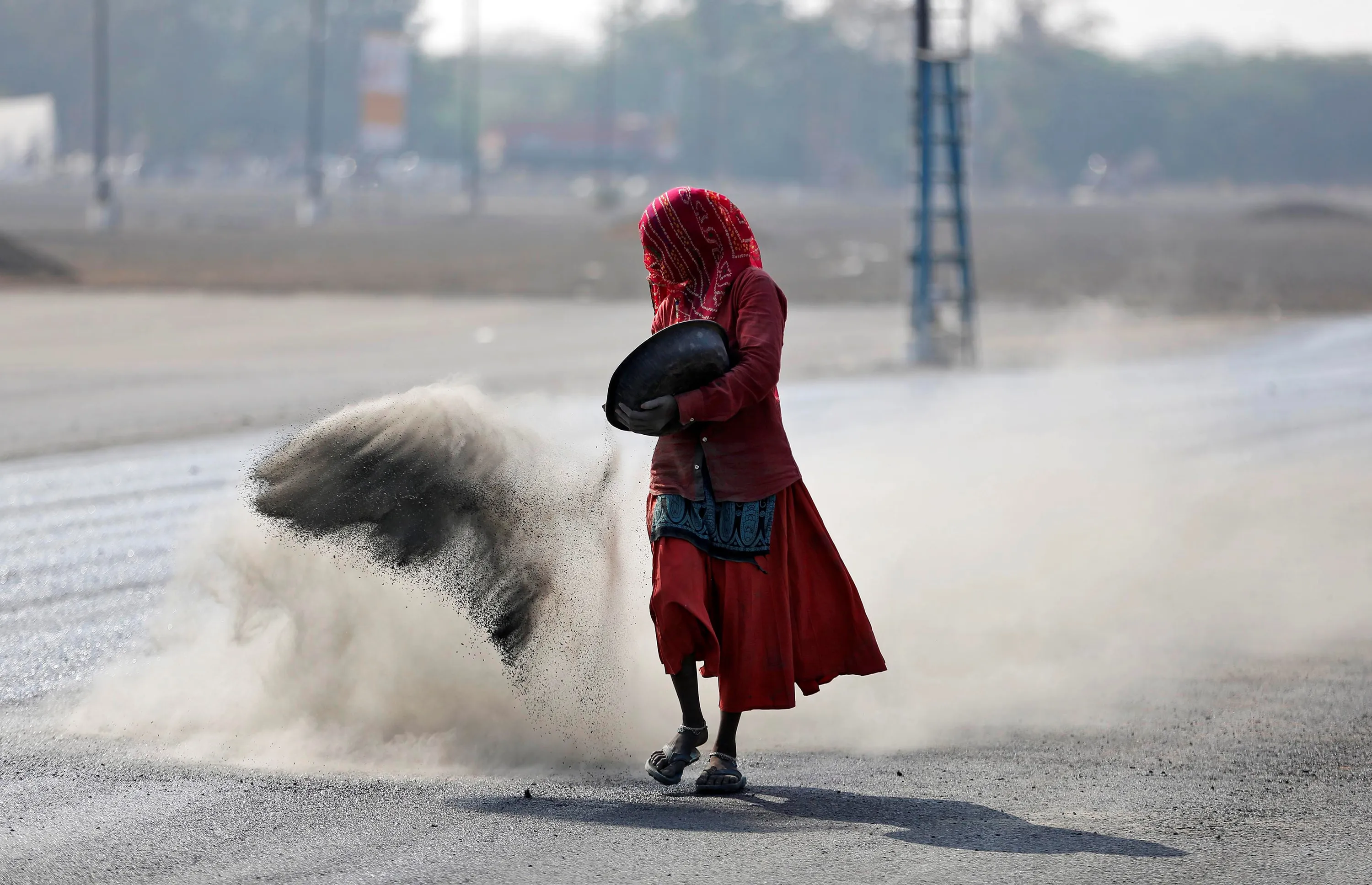 A woman throws a mixture of black ash, cement, concrete powder and ordinary dust over newly constructed road tarmac to dry it and fill in the gaps, in Ahmedabad, India January 6, 2017. (Photo by Amit Dave/Reuters)