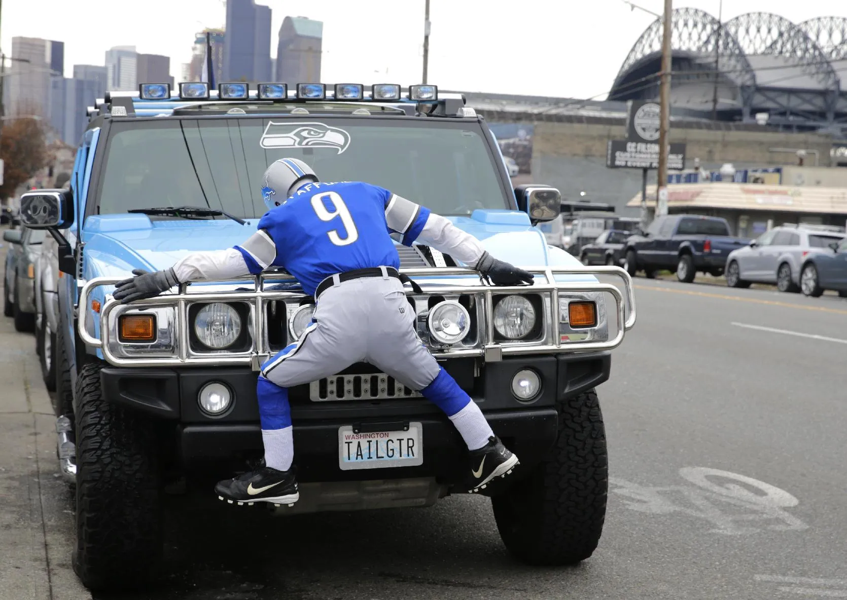 A Seattle Seahawks fan vehicle sits parked with an effigy of Detroit Lions quarterback Matthew Stafford on the hood and bumper near CenturyLink Field before an NFL football NFC wild card playoff football game between the Seahawks and the Lions, Saturday, January 7, 2017, in Seattle. (Photo by Stephen Brashear/AP Photo)