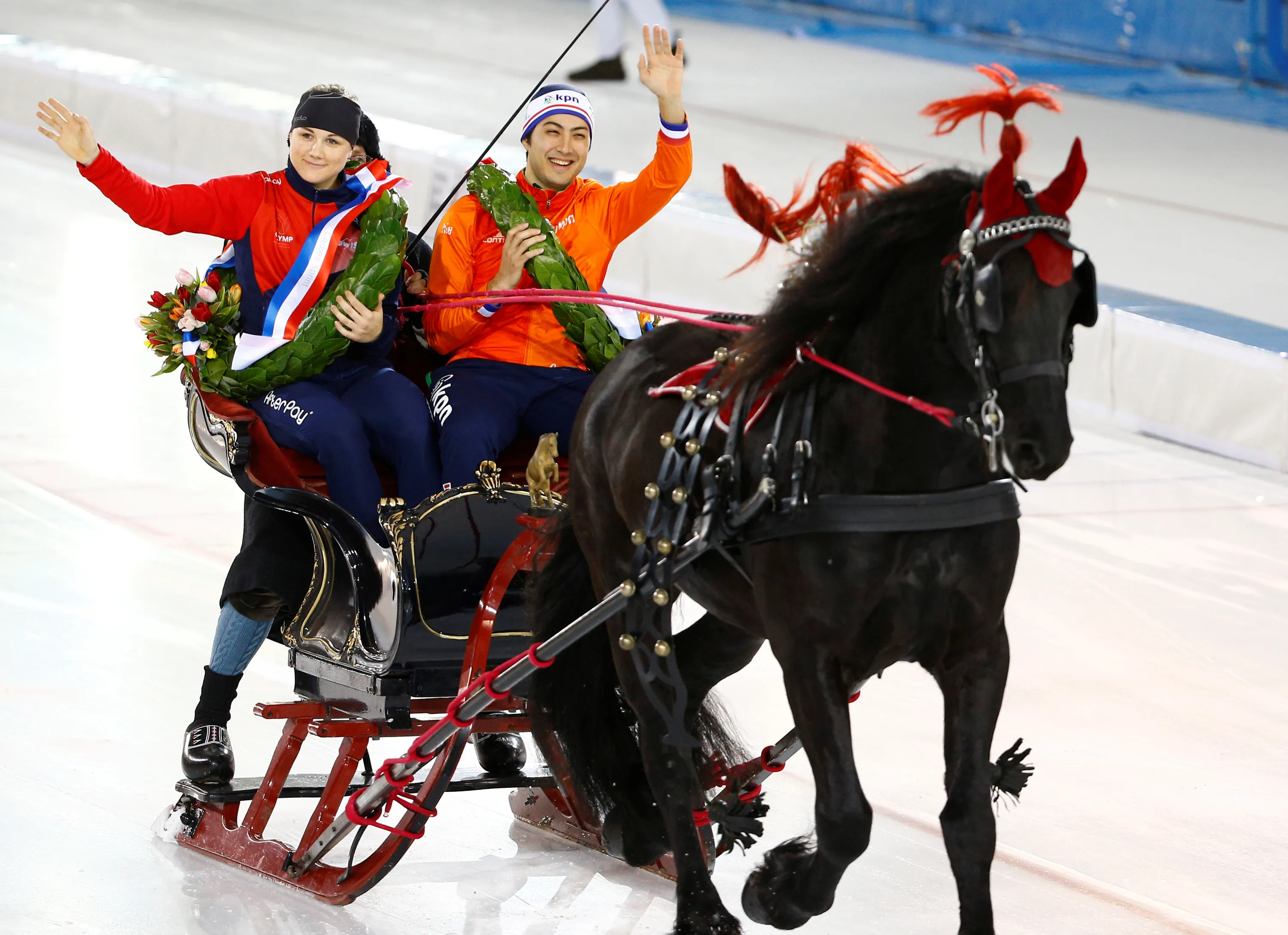 Karolina Erbanova of the Czech Republic and Kai Verbij of the Netherlands celebrate aftter they become the Sprint European Champions on Day Three of the ISU European Speed Skating Championships held at the Thialf on January 8, 2017 in Heerenveen, Netherlands. (Photo by Michael Kooren/Reuters)