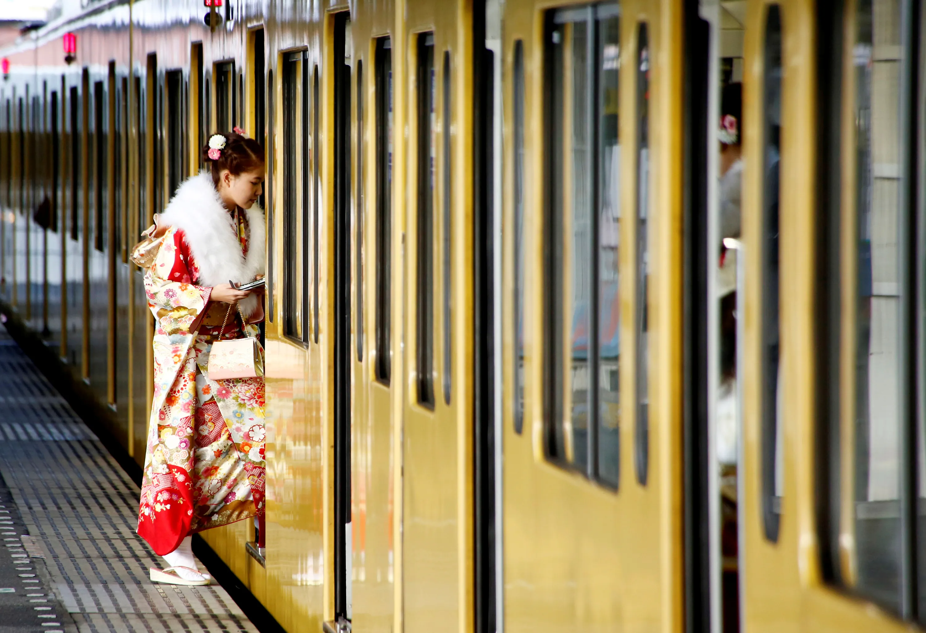 A Japanese woman wearing a kimono gets on a train after the Coming of Age Day celebration in Tokyo, Japan January 9, 2017. (Photo by Kim Kyung-Hoon/Reuters)