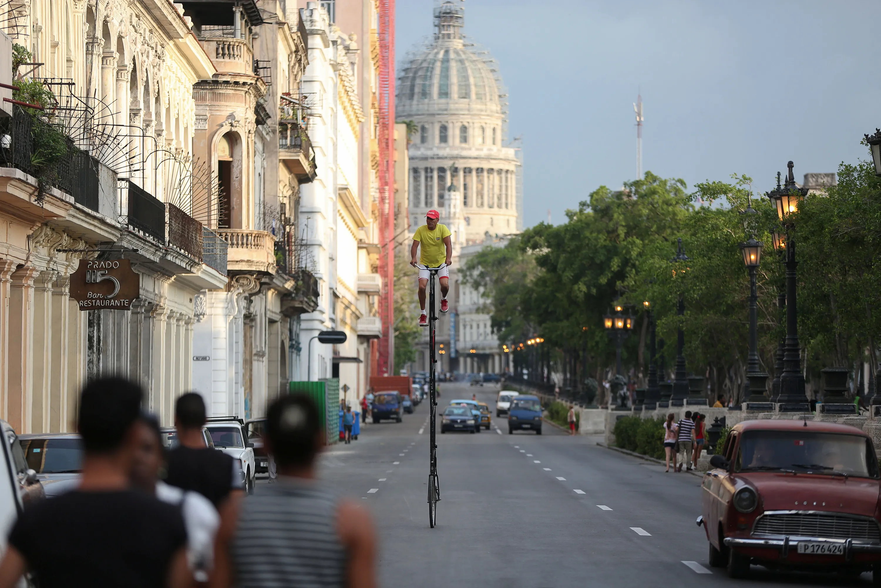 Felix Guirola, 52, rides a homemade bike with an advertising banner in Havana, Cuba, July 20, 2016. (Photo by Alexandre Meneghini/Reuters)