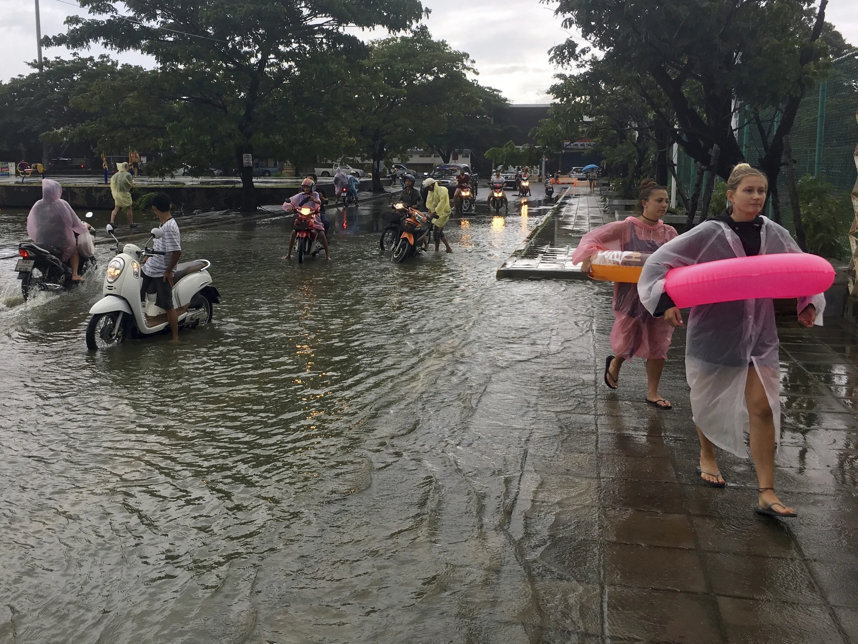 In this Thursday, January 5, 2017 file photo, tourists wear flotation devices while scooter riders pause before crossing a flooded roadway on Ko Samui, Thailand. Authorities say at least 25 people have died in severe flooding in southern Thailand since New Year’s, leaving businesses paralyzed and thousands of tourists stranded. The Interior Ministry said in a report Tuesday that the main highway connecting the south with the rest of the country was swamped. (Photo by Adam Schreck/AP Photo)
