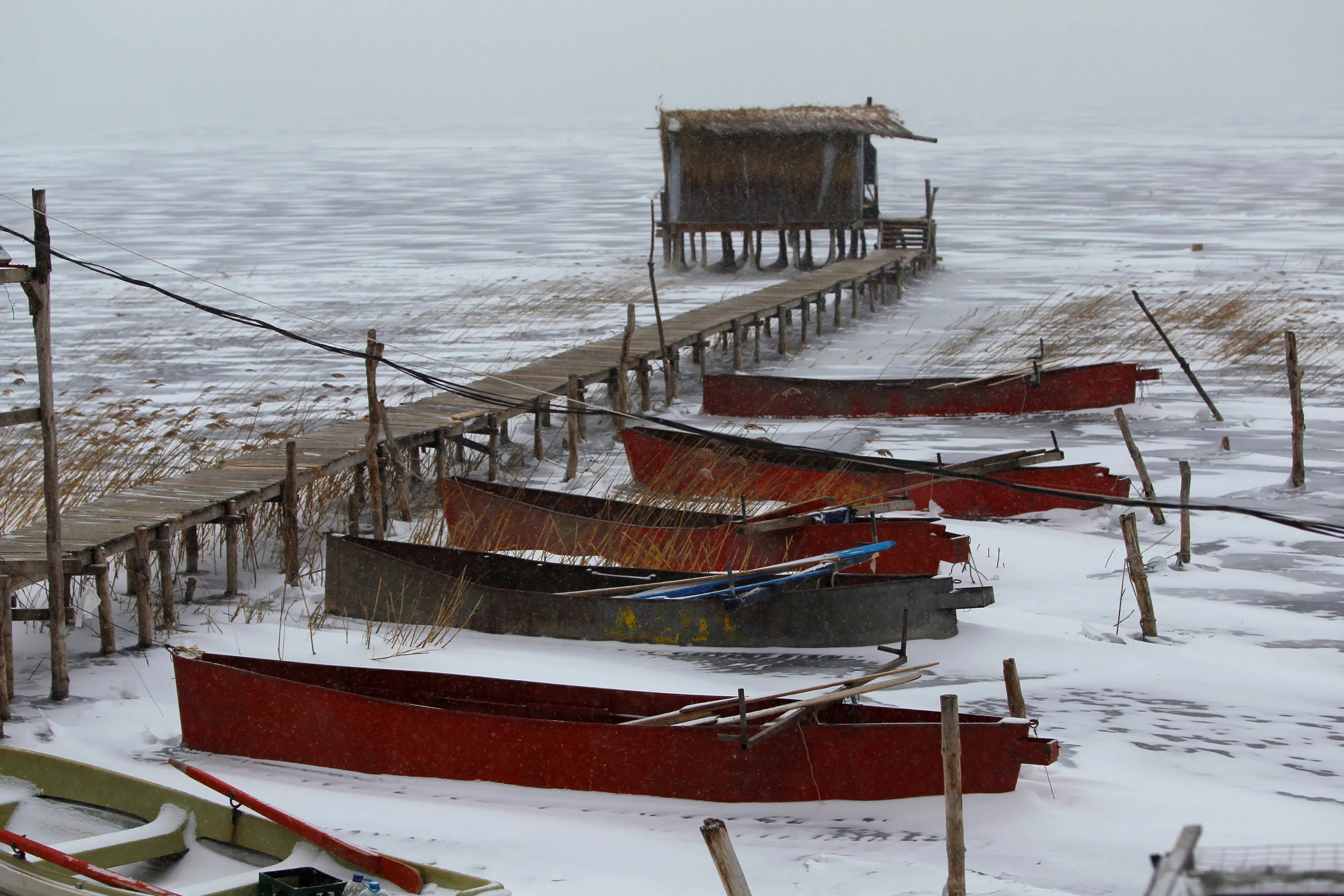 Fishing boats are stuck in the frozen Dojran lake, Macedonia January 11, 2017, as icy weather continues across Europe. (Photo by Ognen Teofilovski/Reuters)