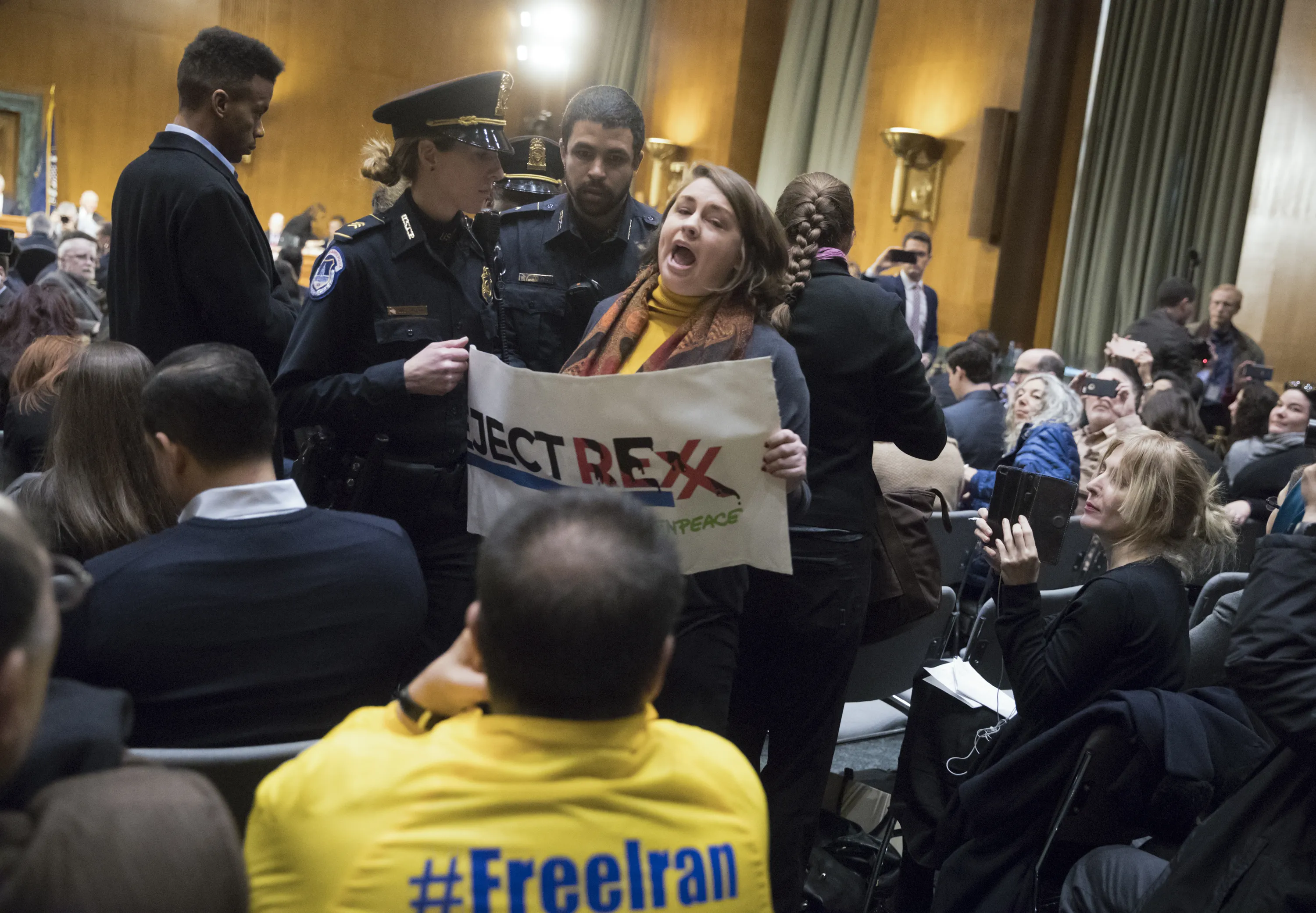 A protester is removed by Capitol Hill Police after shouting and disrupting the confirmation hearing for Secretary of State designate Rex Tillerson before the Senate Foreign Relations Committee, Wednesday, January 11, 2017, on Capitol Hill in Washington. (Photo by J. Scott Applewhite/AP Photo)