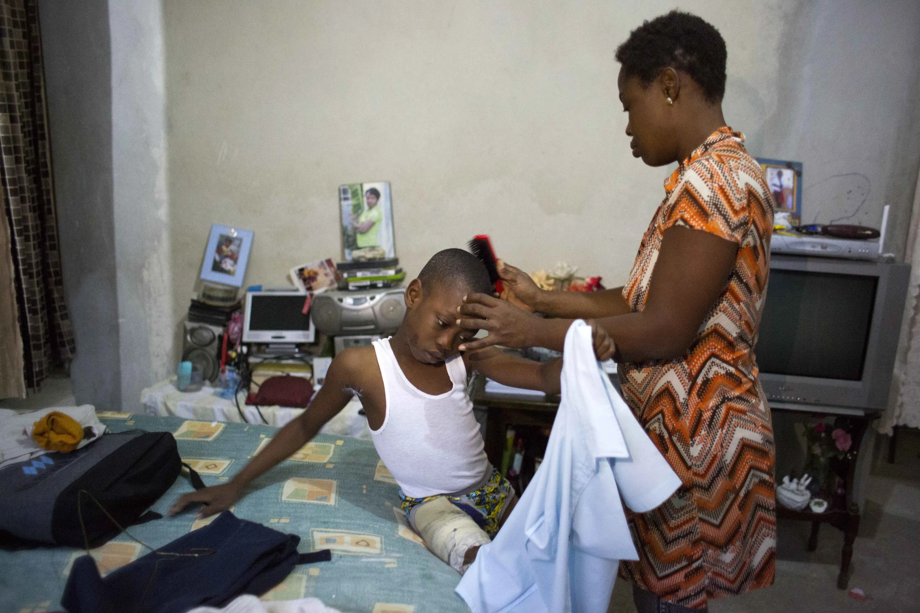 In this January 10, 2017 photo, Judeley Hans Debel, who uses a prosthetic right leg, holds still as his mother Nerlande Jean Philippe readies him for school at their home in Petion-Ville, Haiti. Despite his amputated leg, Judeley enthusiastically plays soccer and other games with schoolmates and hopes to study medicine when he's older. (Photo by Dieu Nalio Chery/AP Photo)