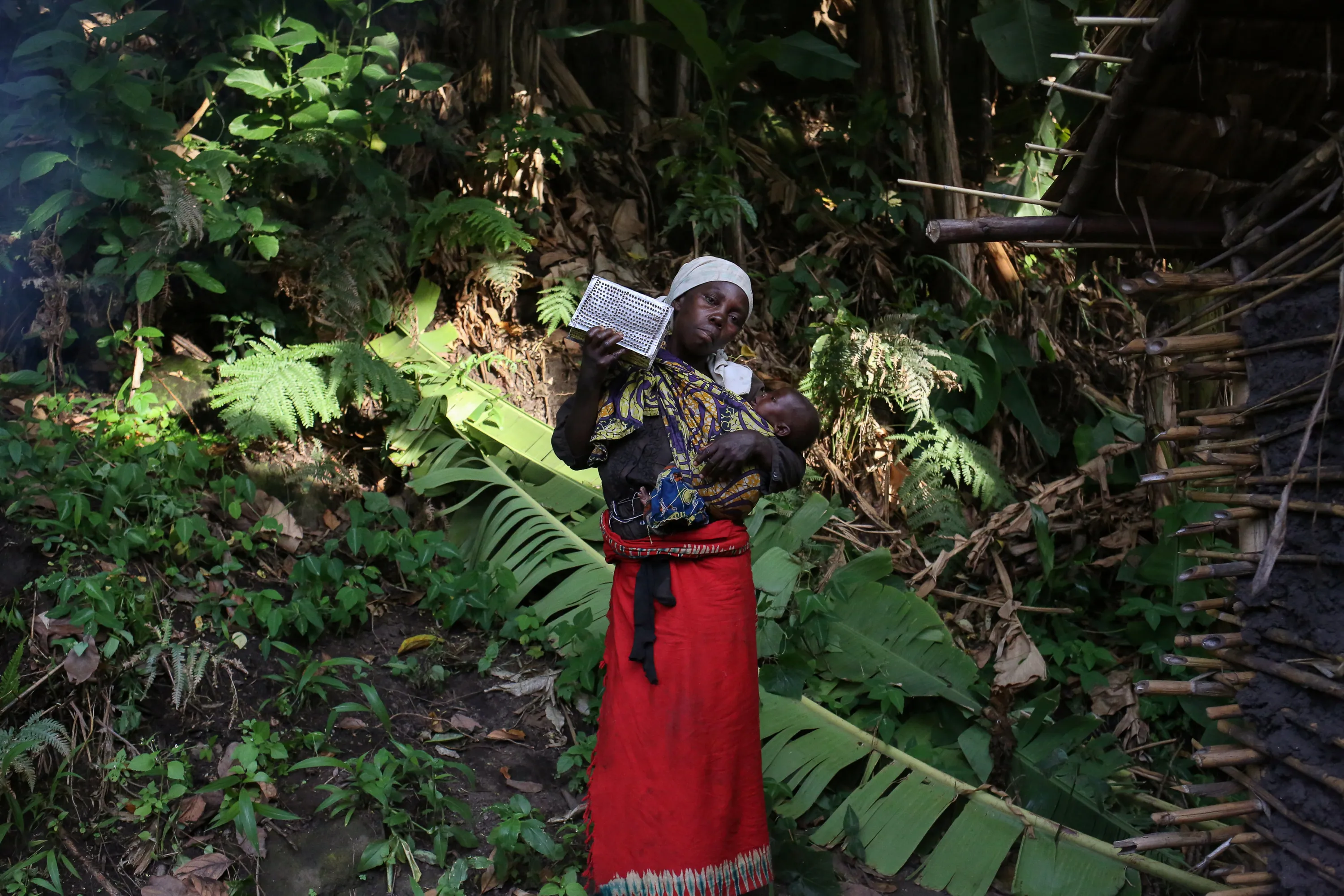 A Pygmy woman, 20, shakes a pendo, a musical instrument made from a metal box filled with gravel, to calm her crying child, at Kagorwa Pygmy camp on Idjwi island in the Democratic Republic of Congo, November 22, 2016. (Photo by Therese Di Campo/Reuters)