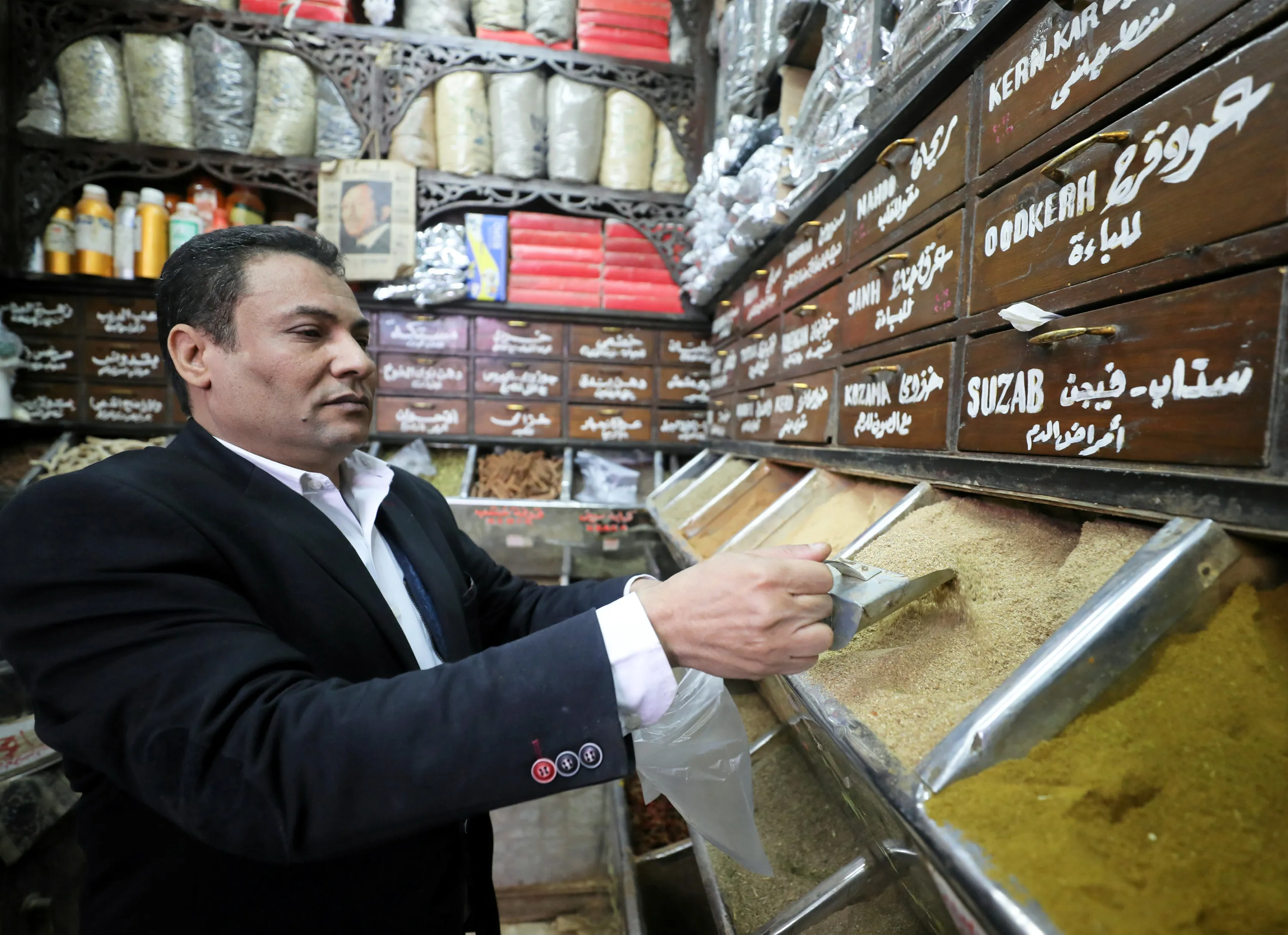 Samy Al Aatar, owner of a herbal store, takes ingredients to prepare natural herbal drug in Cairo, Egypt January 10, 2017. In an economic crisis that has led to a shortage of medicines, Egyptians are skipping trips to drug stores and instead turning to herbal remedies to treat every-day illnesses. In the Cairo working class neighborhood of Basateen, dozens line up outside a decades-old herbal spice shop with pyramid-shaped stacks of jars on display, filled with everything from honey and ginger to camel's hay. Apothecaries say there has been a roughly 70-80 percent increase in sales of their wares since a series of harsh economic reforms hit supplies of conventional medicines and increased the cost of some generic and even life-saving drugs. The government said on Thursday those price rises could reach as high as 15 percent for domestically-produced medicines and 20 percent for imports. Store owner Samy al-Attar – whose last name is Arabic for apothecary – says a knowledgeable apothecary can find substitutes for drugs treating almost all non-terminal illnesses. Just like pharmacies, the walls inside al-Attar's store are lined with drawers and containers. But rather than drugs, they hold herbs, each said to have its own unique healing property. Customers crowd outside the shop window, as staff dash around the tiny interior, choosing from a variety of textures and colors, filling clear plastic bags with orders. Customers explain their symptoms and Al-Attar produces a concoction of spices and herbs – with a more affordable price tag then at the conventional chemists. Local spices and herbs cost between 5 and 10 Egyptian pounds ($0.27-0.54) per kilogram. (Photo by Mohamed Abd El Ghany/Reuters)