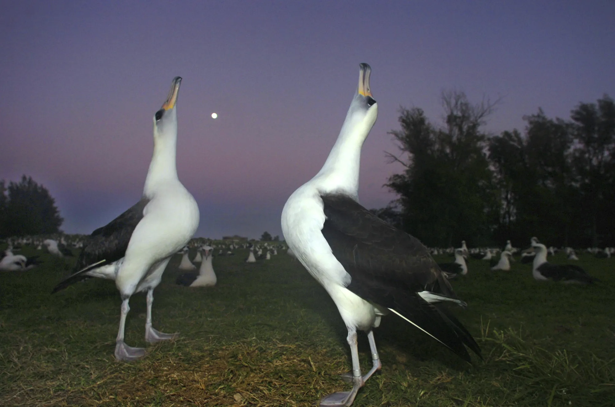 In this December 13, 2005 file photo, two Laysan albatross do a mating dance on Midway Atoll in the Northwestern Hawaiian Islands. The Battle of Midway was a major turning point in World War II's Pacific theater. But the remote atoll where thousands died is now a delicate sanctuary for millions of seabirds, and a new battle is pitting preservation of its vaunted military history against the protection of its wildlife. Midway, now home to the largest colony of Laysan albatross on Earth, is on the northern edge of the recently expanded Papahanaumokuakea Marine National Monument, now the world's biggest oceanic preserve. (Photo by Lucy Pemoni/AP Photo)