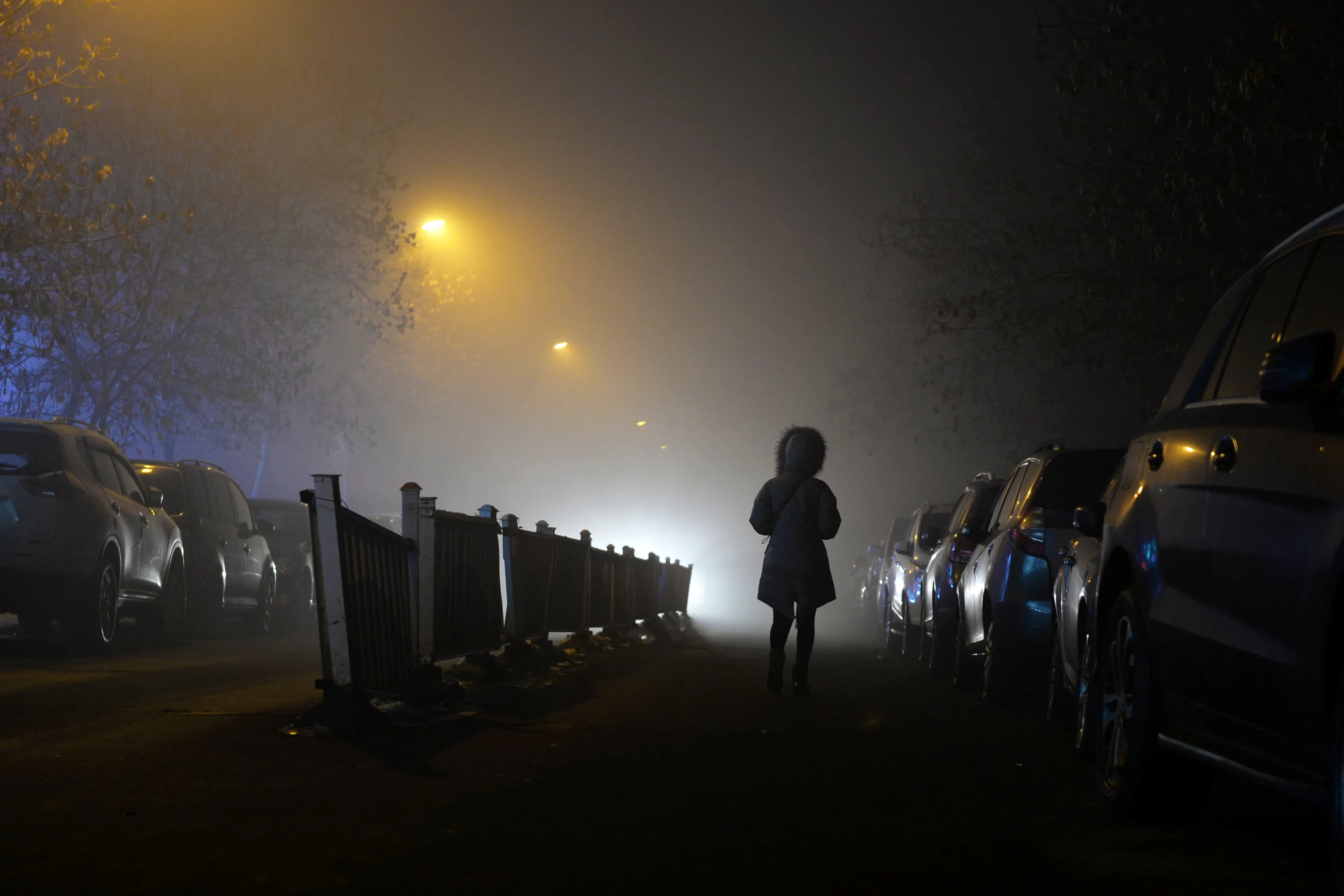 A woman walks past parked cars in heavy smog in Urumqi, Xinjiang Uighur Autonomous Region, China January 7, 2017. (Photo by Reuters/Stringer)