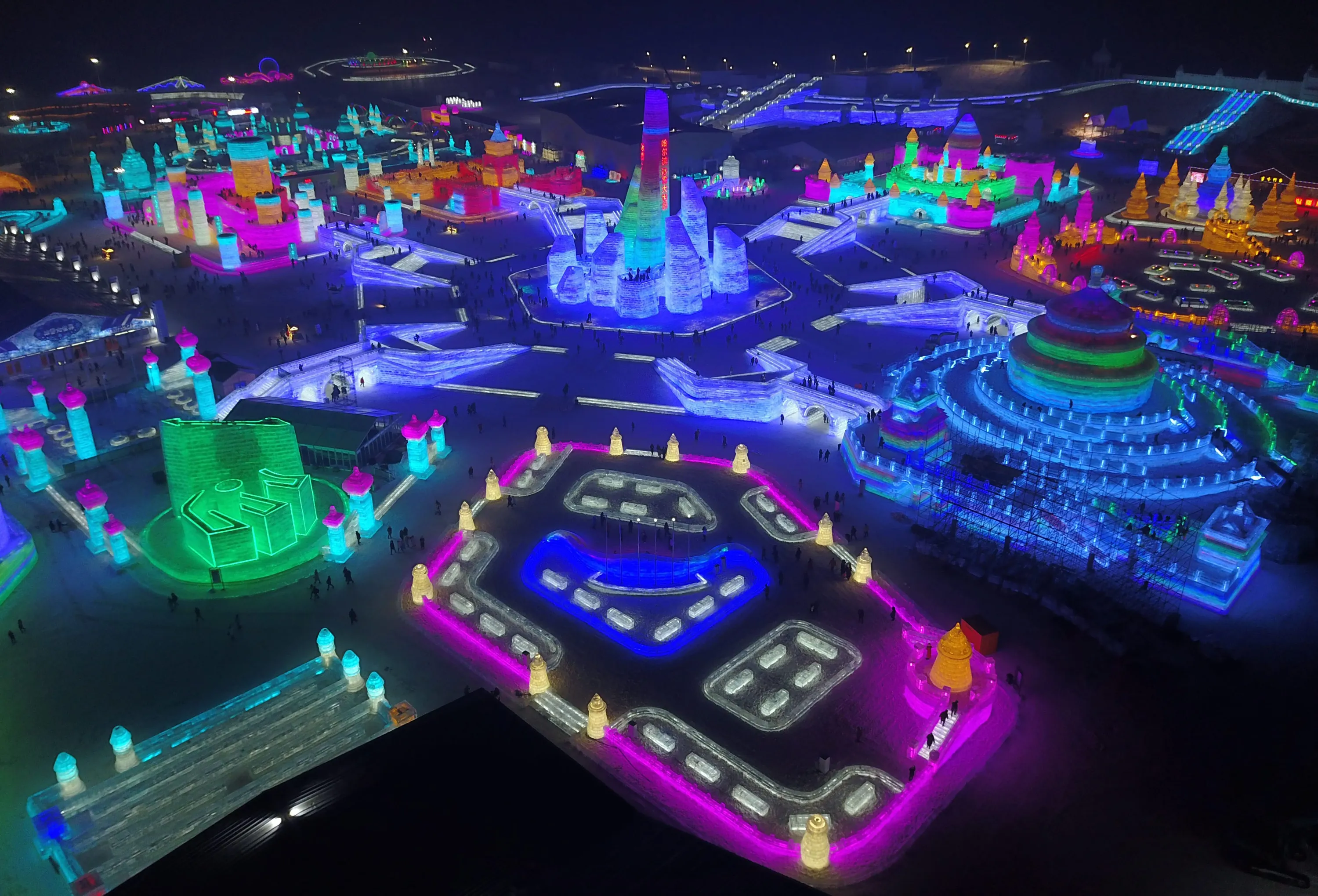 An aerial view shows people touring between the large-scale ice sculptures at the 18th Harbin Ice and Snow World during its trial run opening to public in Harbin city, Heilongjiang province, China, 21 December 2016. Some 180,000 cubic meters of ice and 150,000 cubic meters of snow were used to build the 800,000-square-meter ice wonderland. The 33rd Harbin International Ice and Snow Festival will kick off on 05 January 2017 that will last about three months. (Photo by Tian Weitao/EPA)