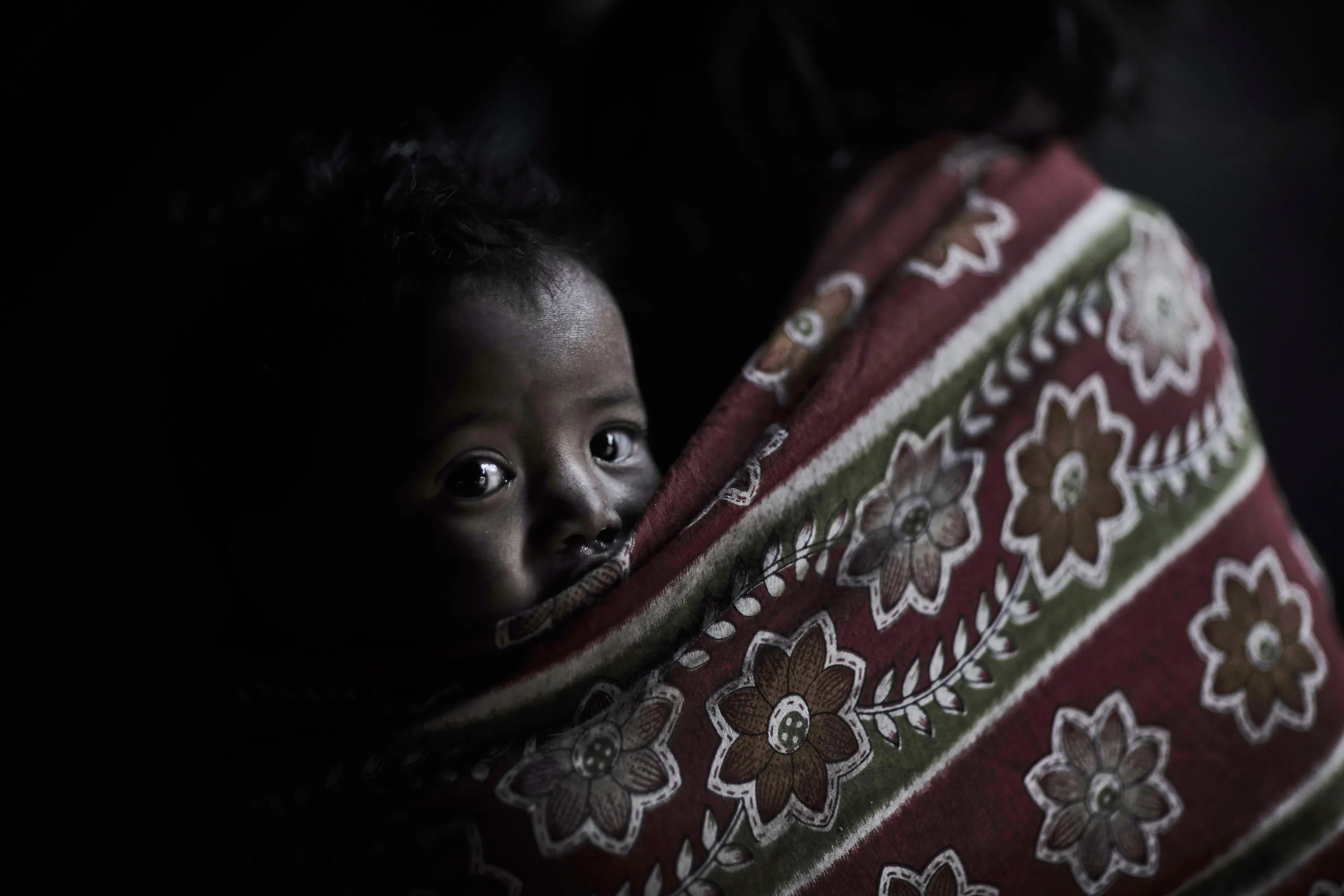 A young Raute baby peeks out of her shroud in Accham District, Nepal, January 2016. (Photo by Jan Moller Hansen/Barcroft Images)