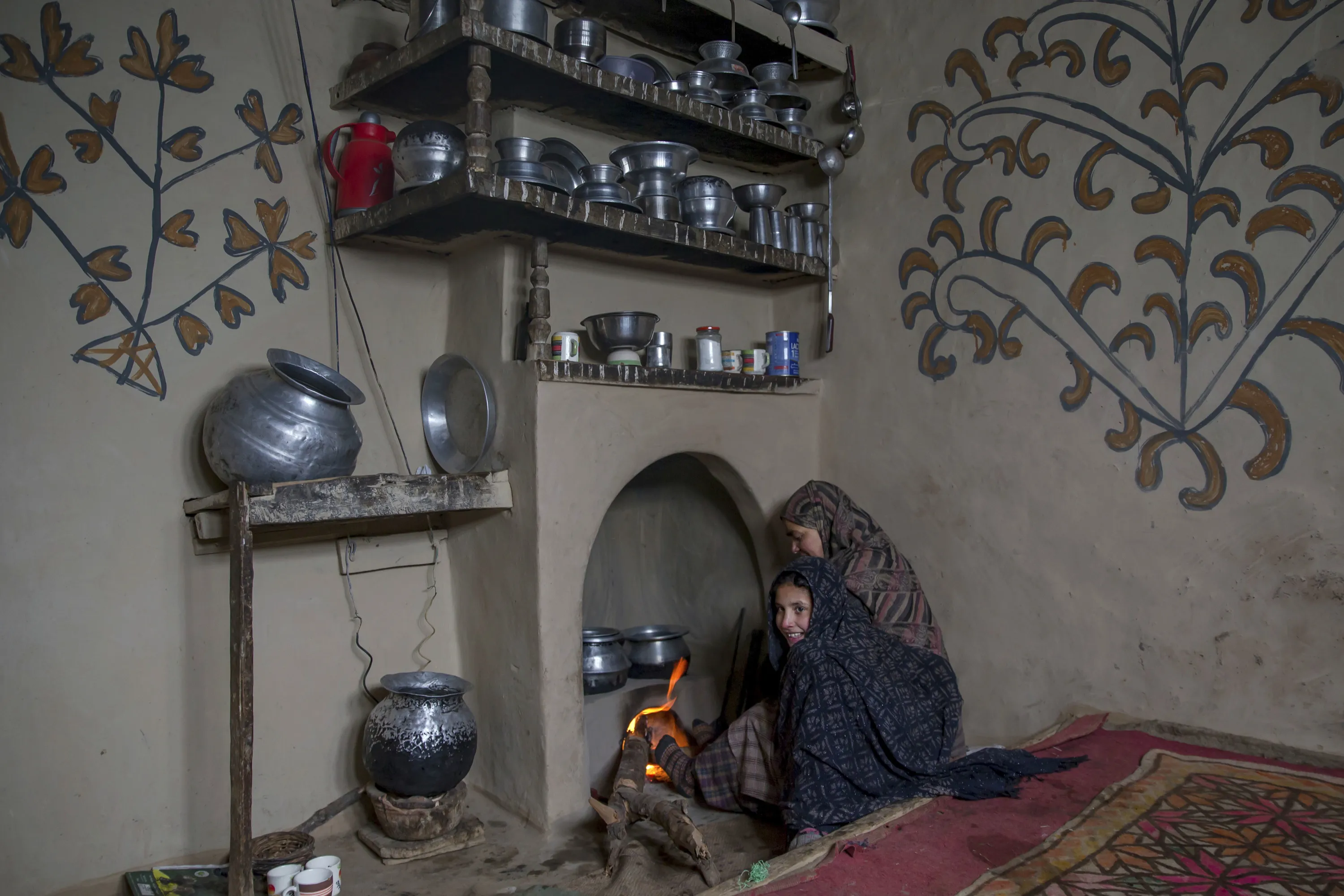 Kashmiri girl Rashid warms her feet by the fireplace, as her mother prepares food inside their house near Faqir Gujri, 28 Kilometres from Srinagar, Indian controlled Kashmir, Friday, January 13, 2017. The Kashmir valley has been experiencing intense cold conditions with widespread snowfall for the past week. (Photo by Dar Yasin/AP Photo)
