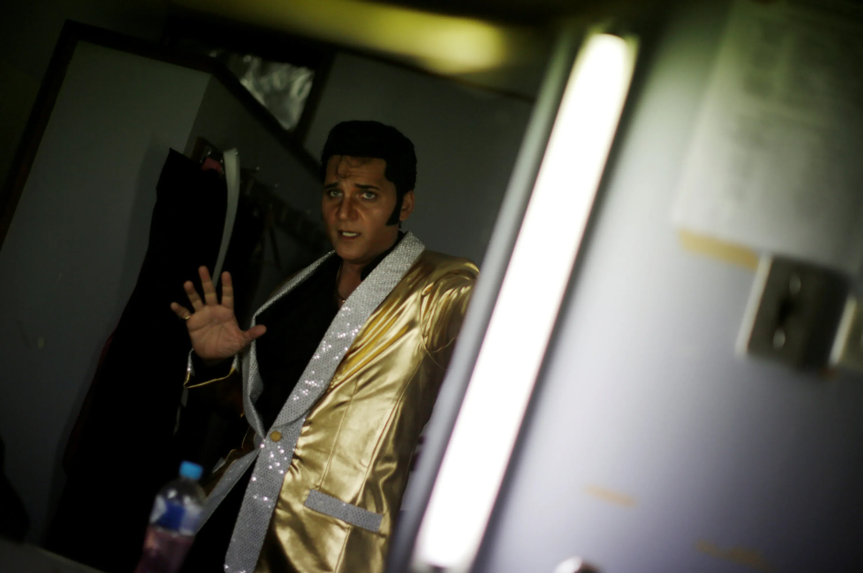 Ultimate Elvis tribute artist competitor Stuart Vieyra from Queensland practices dance moves in the mirror back stage before the final round of the contest at the 25th annual Parkes Elvis Festival in the rural Australian town of Parkes, west of Sydney, January 14, 2017. (Photo by Jason Reed/Reuters)