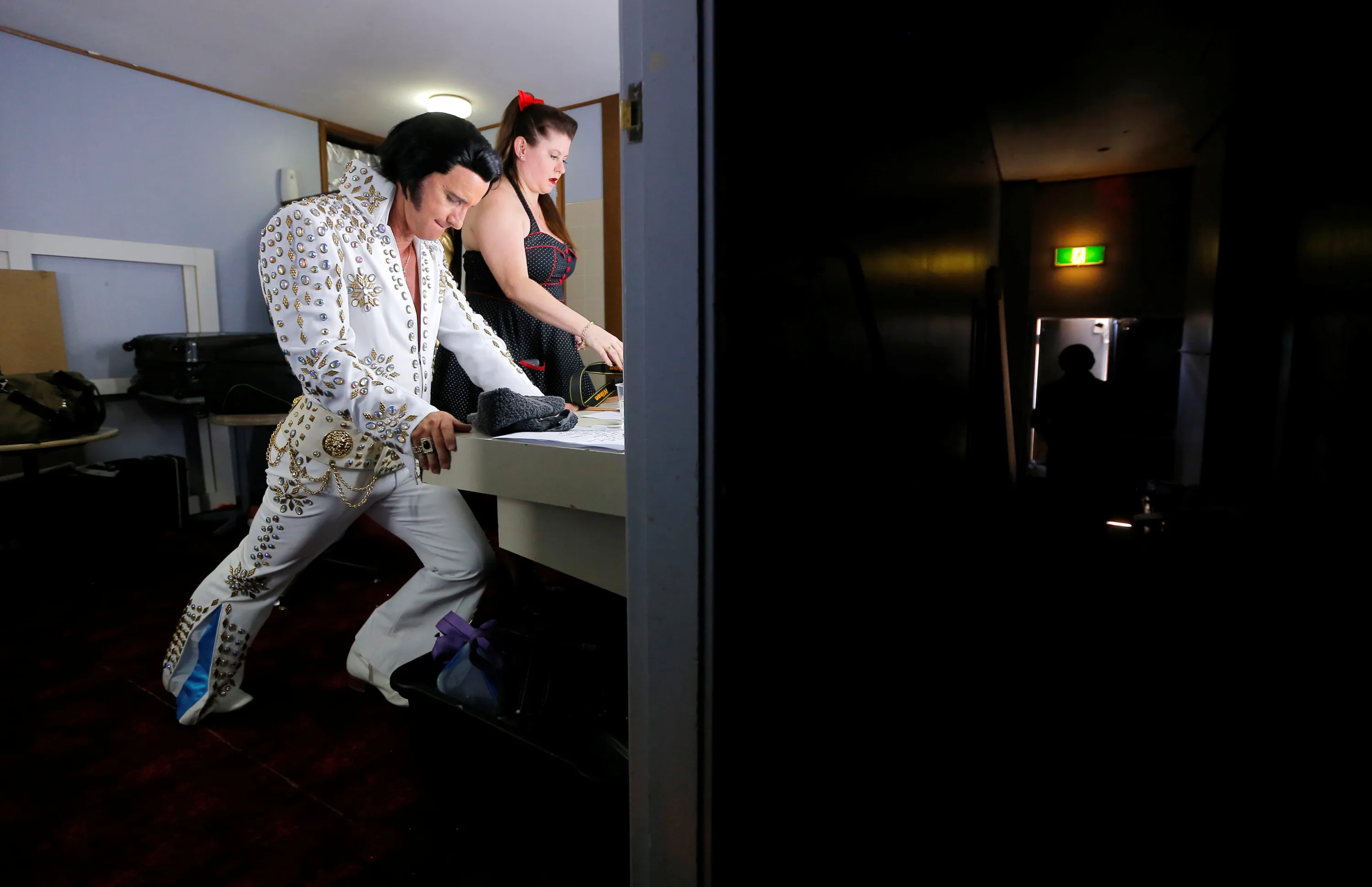 Elvis tribute artist Stephen Fletcher from Queensland stretches in the dressing room before performing in the final of the Ultimate Elvis tribute artist competition at the 25th annual Parkes Elvis Festival in the rural Australian town of Parkes, west of Sydney, January 14, 2017. (Photo by Jason Reed/Reuters)