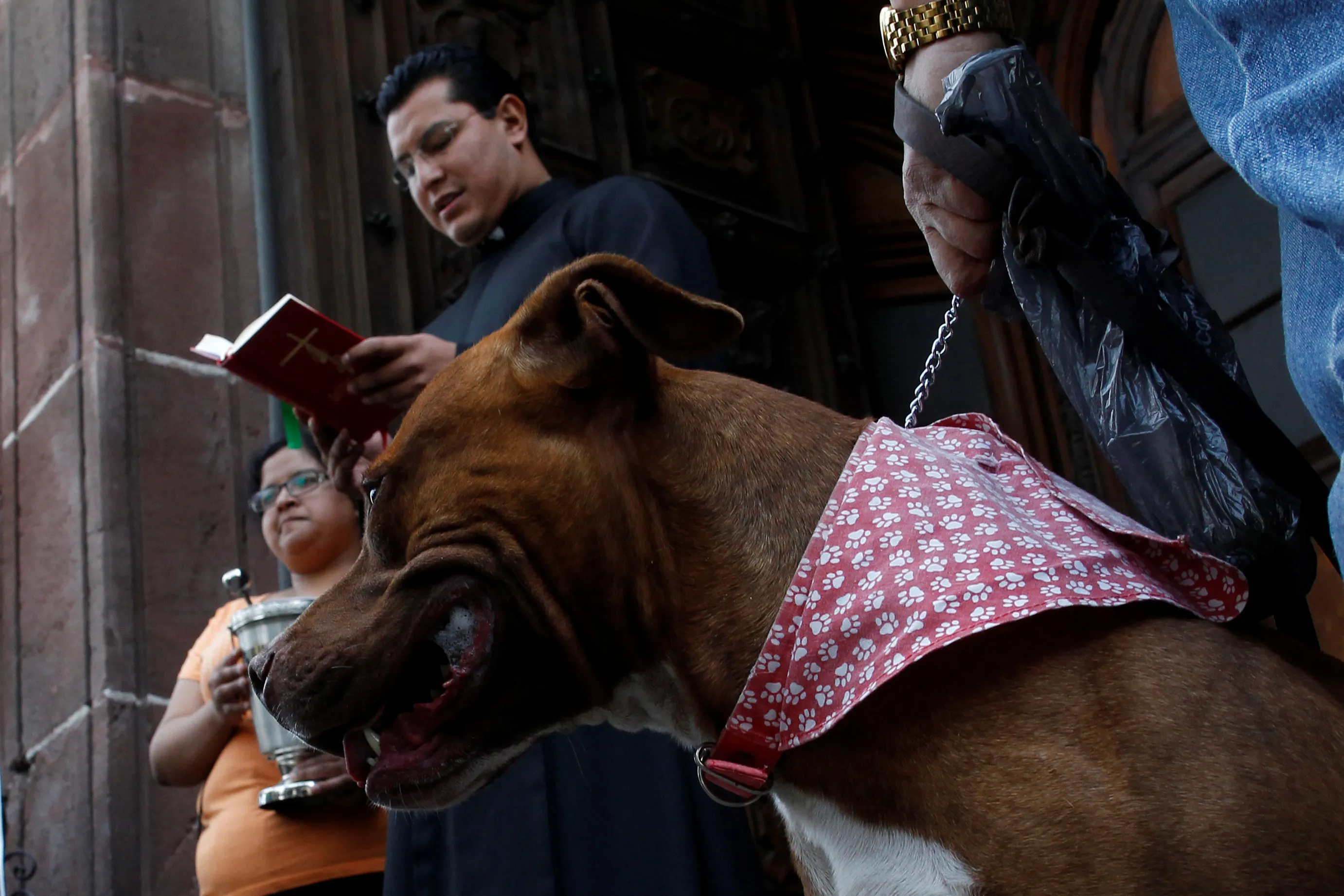 A dog sits next to its owner as it receives blessings from a priest on the day of Saint Anthony, the patron saint of domestic animals, in Xochimilco in Mexico City, Mexico January 17, 2017. (Photo by Carlos Jasso/Reuters)