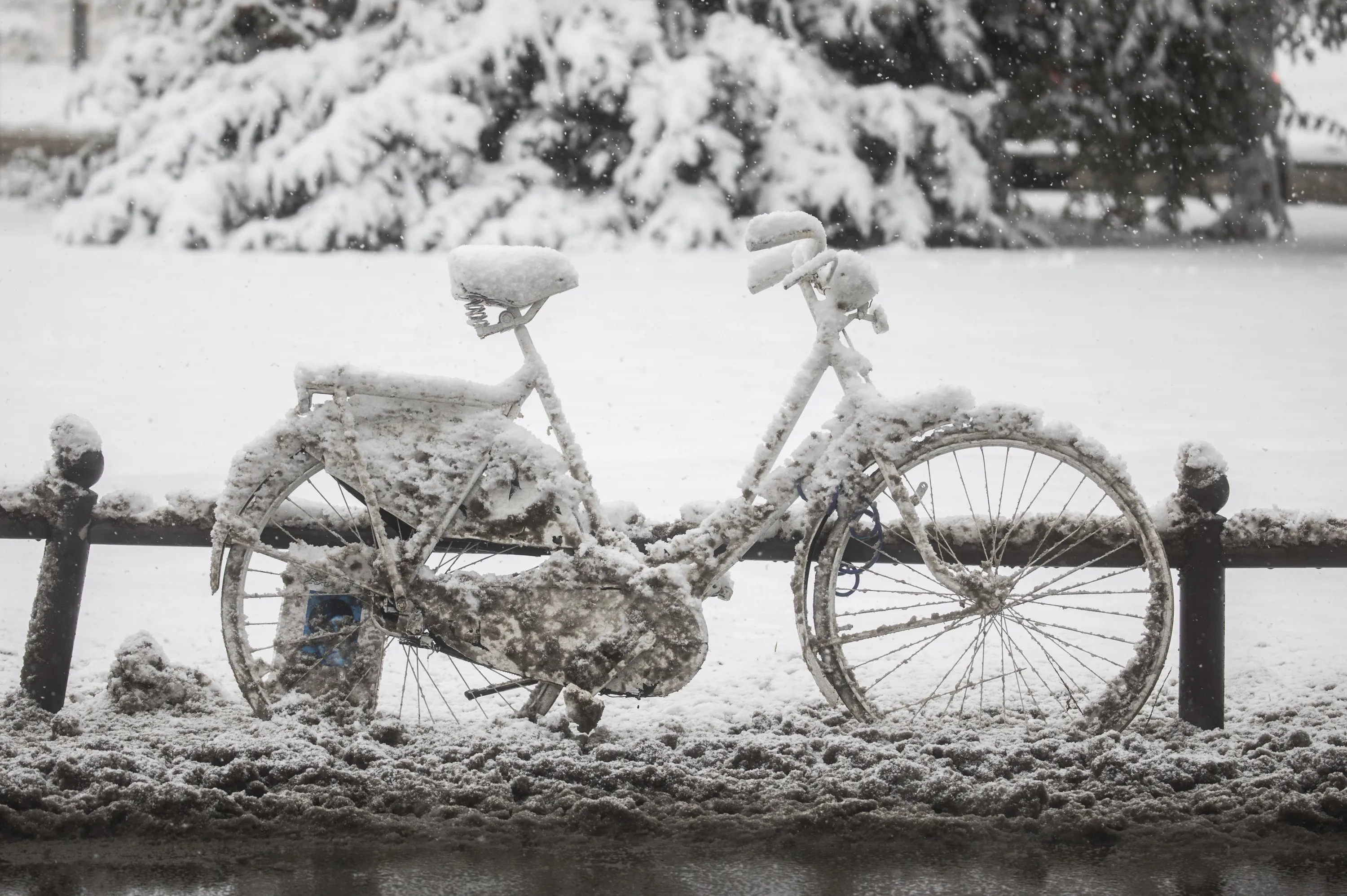 A snow-covered bicycle stands on a roadside in Wiesbaden, western Germany, Tuesday, January 10, 2014. (Photo by Frank Rumpenhorst/DPA via AP Photo)