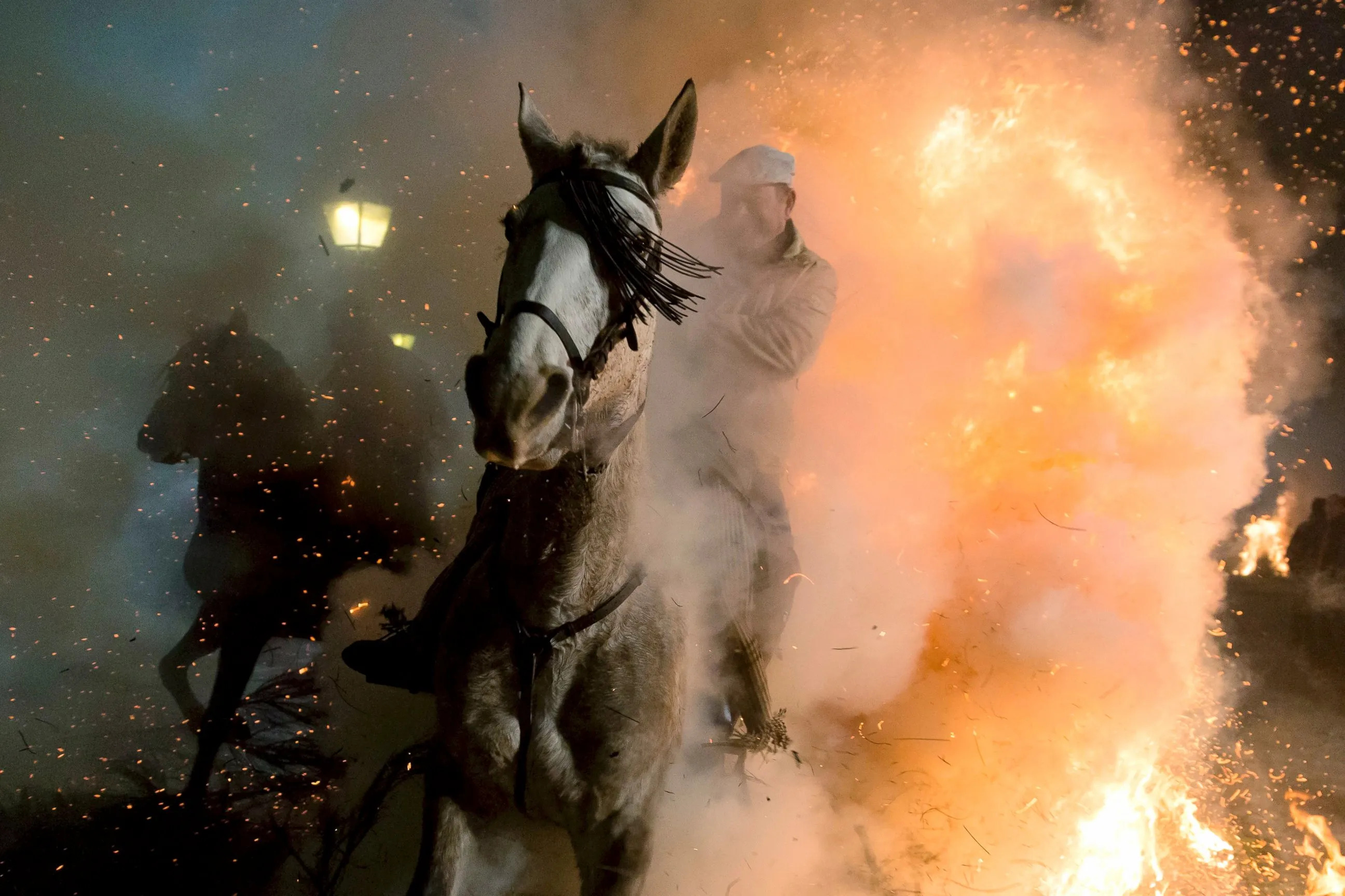 A rider jumps through a bonfire at the “Luminarias” in San Bartolome de Pinares, Avila, Spain, January 16, 2017. Bonfires are placed on the village streets, continuing a more than two centuries tradition which aims to purify the animals. (Photo by Raul Sanchidrian/EPA)