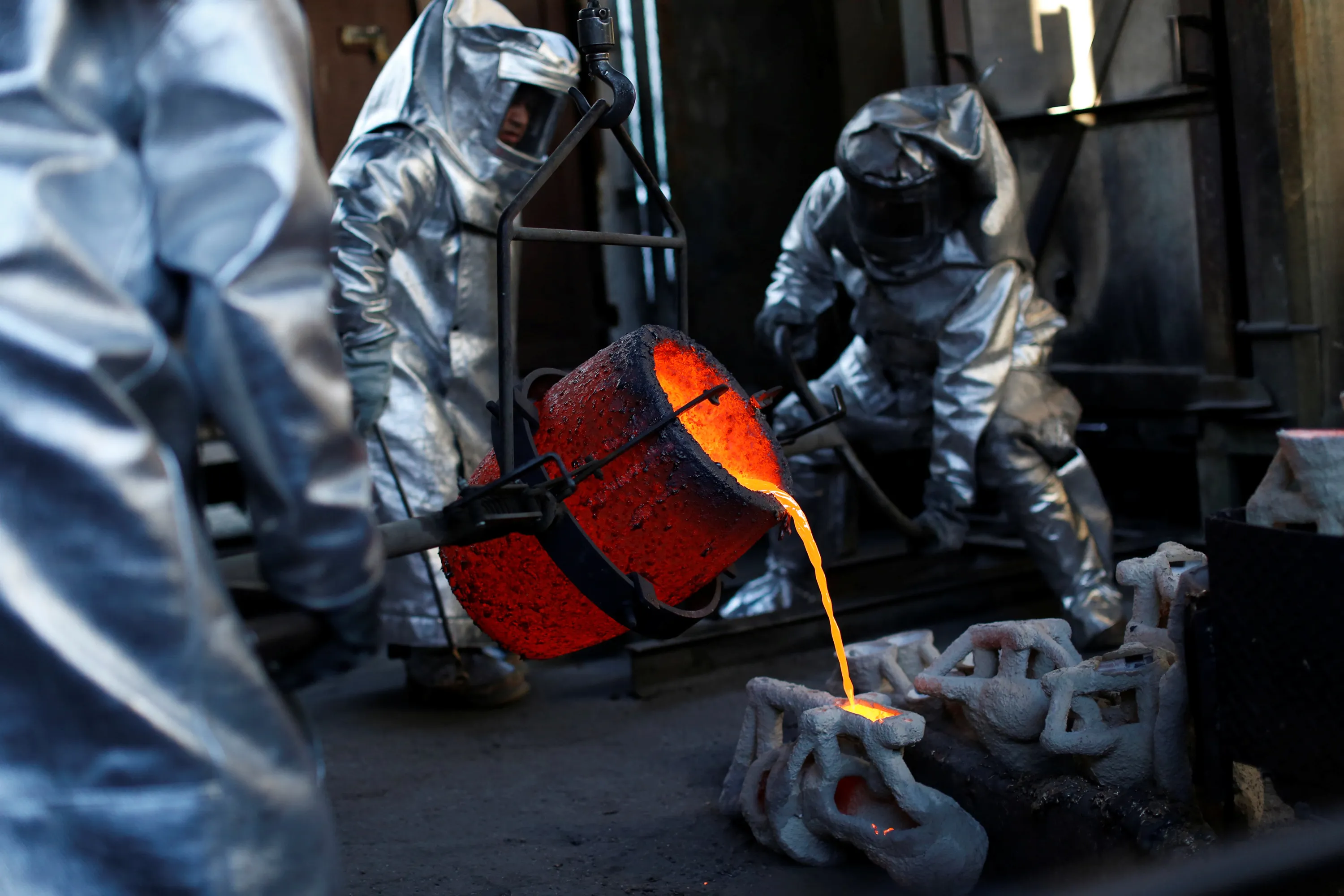 Workers pour molten bronze into molds of “The Actor” statuettes during a media event on the production of the statuettes for the 23rd annual Screen Actors Guild Awards at American Fine Arts Foundry in Burbank, California, U.S., January 17, 2017. (Photo by Mario Anzuoni/Reuters)