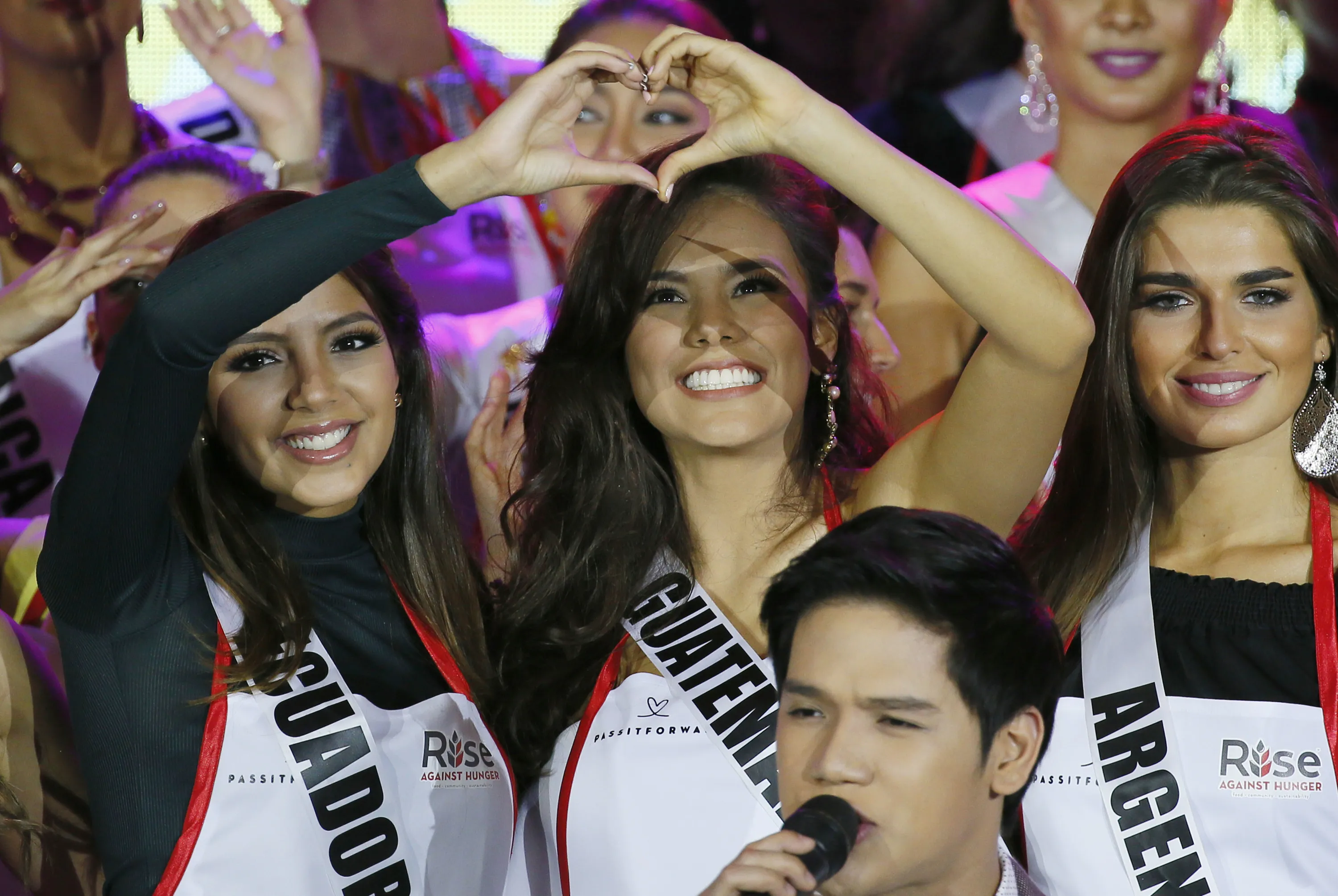 Miss Universe contestants Connie Jimenez of Ecuador, left, and Virginia Argueta of Guatemala, form a heart as Filipino singer Gerald Santos serenades them prior to joining an NGO to pack meals for distribution to the needy in suburban Pasay city southeast of Manila, Philippines Wednesday, January 18, 2017. (Photo by Bullit Marquez/AP Photo)