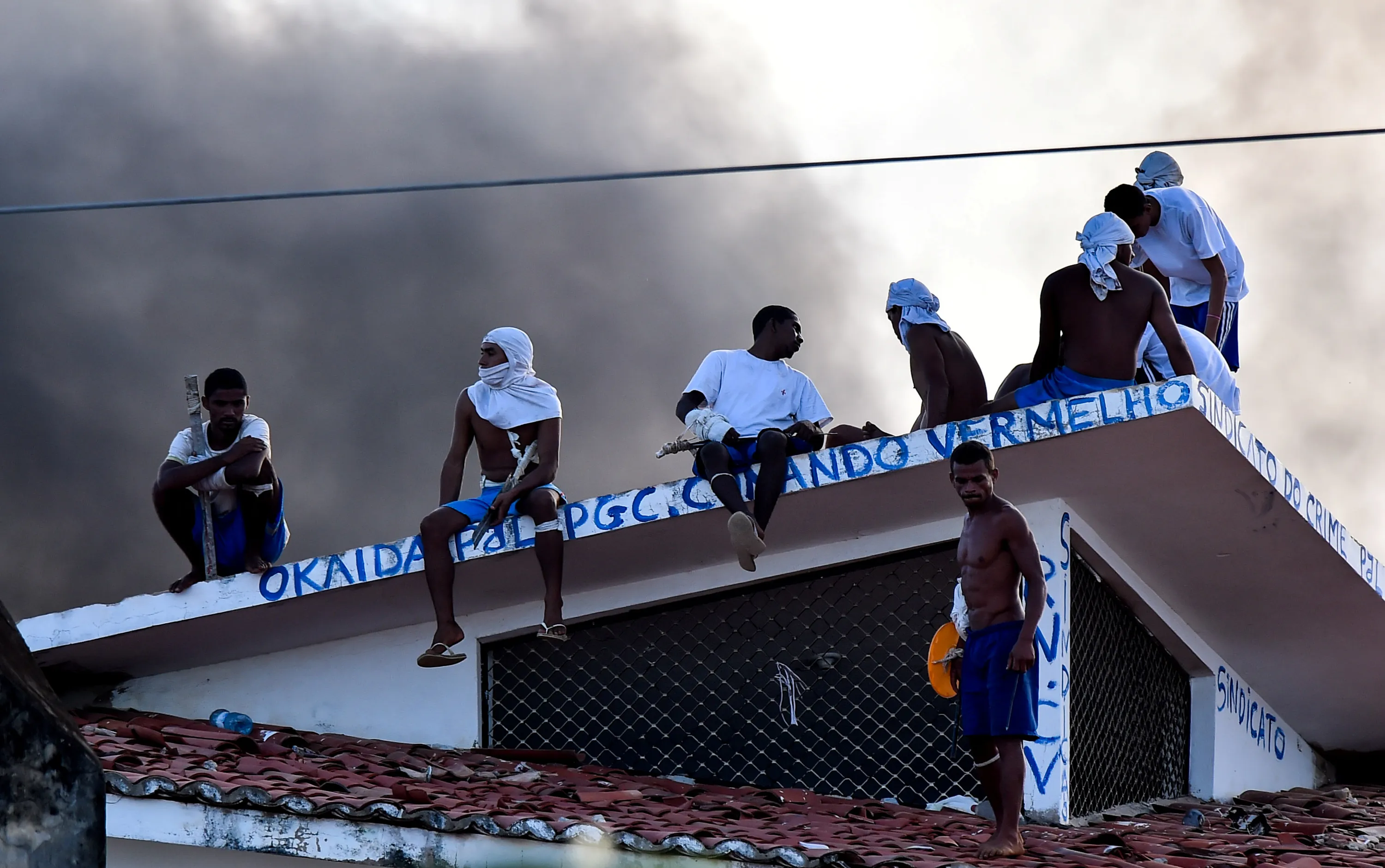 Inmates are seen on a roof during an uprising at the Alcacuz prison in Natal, Rio Grande do Norte state, Brazil, January 19, 2017. (Photo by Josemar Goncalves/Reuters)