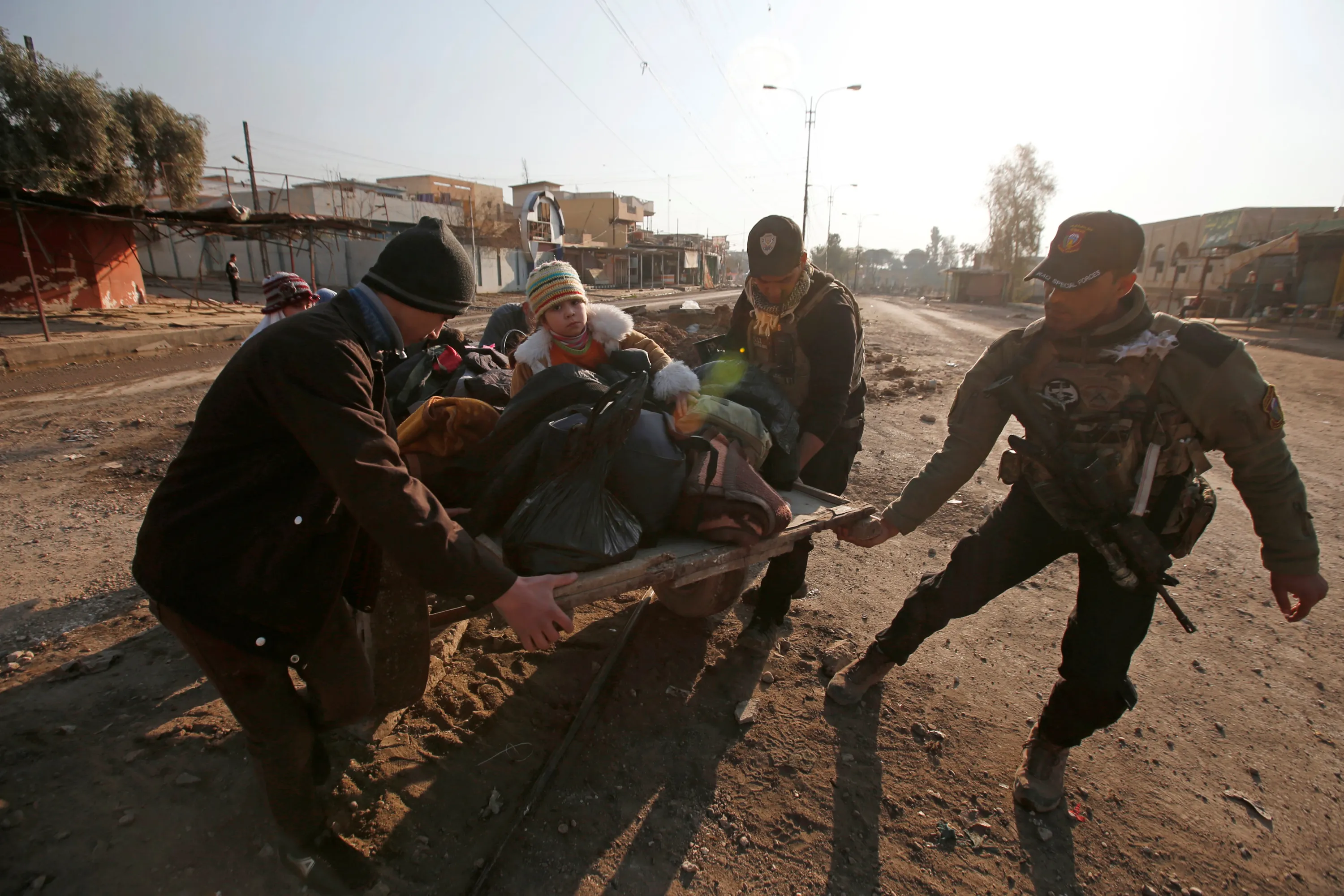 Iraqi forces help displaced people as they flee during a battle with Islamic State militants, in the al-Zuhoor neighborhood of Mosul, Iraq, January 8, 2017. (Photo by Azad Lashkari/Reuters)