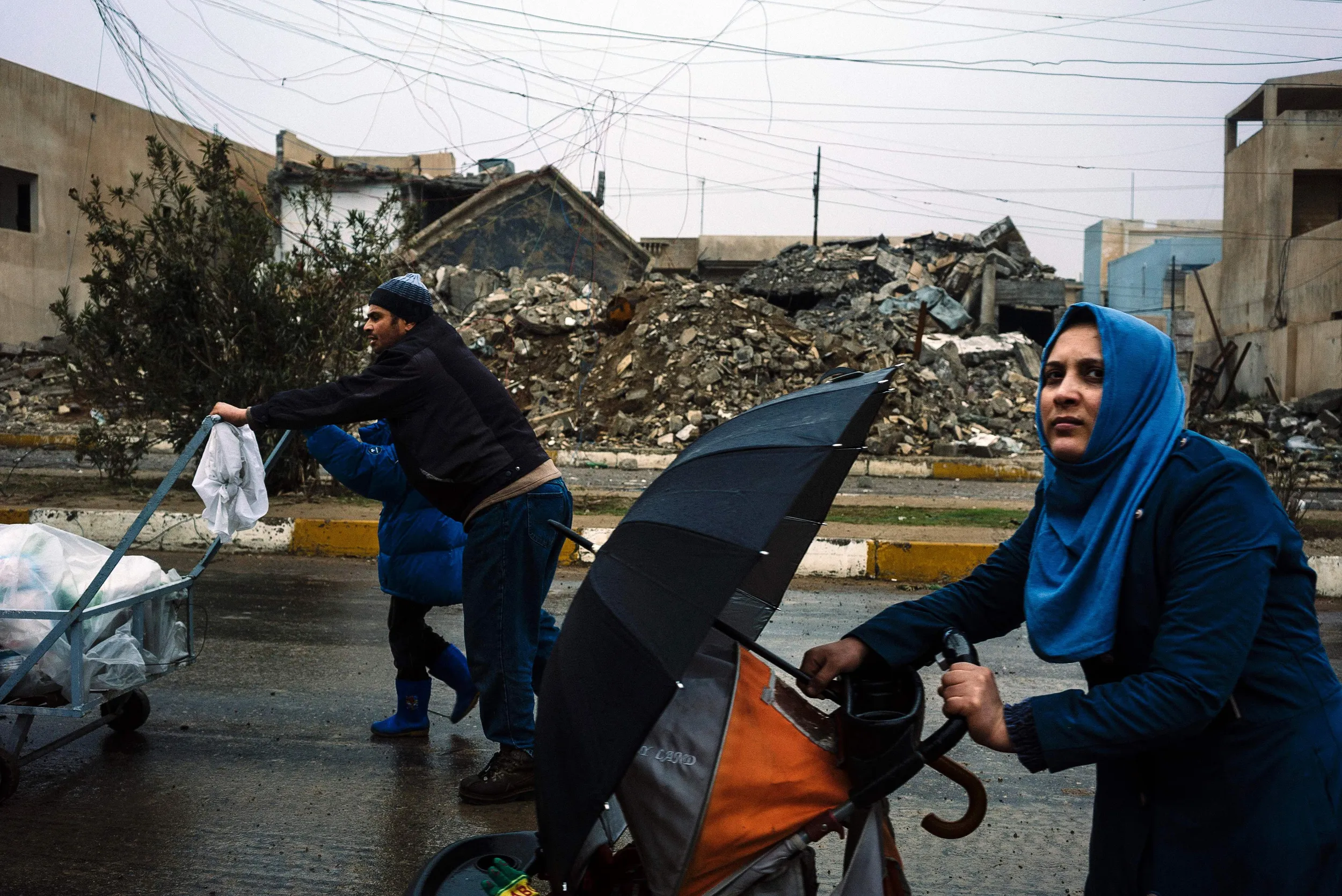 An Iraqi family walks on a street in eastern Mosul on January 15, 2017, as they flee with other civilians during an ongoing military operation against Islamic State (IS) group jihadists. (Photo by Dimitar Dilkoff/AFP Photo)