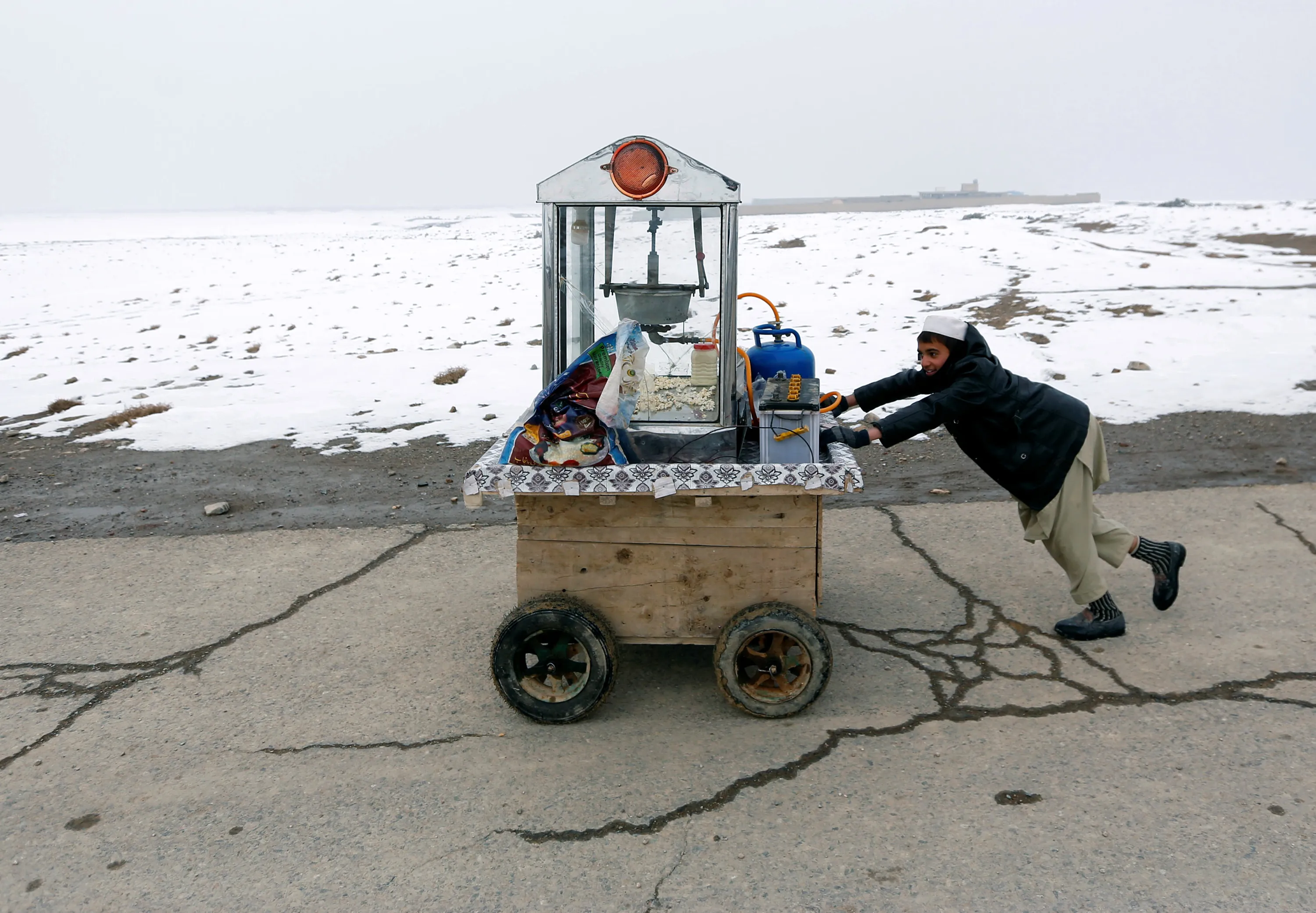An Afghan boy pushes a popcorn machine as he looks for customers, on the outskirts of Kabul, Afghanistan January 17, 2017. (Photo by Mohammad Ismail/Reuters)