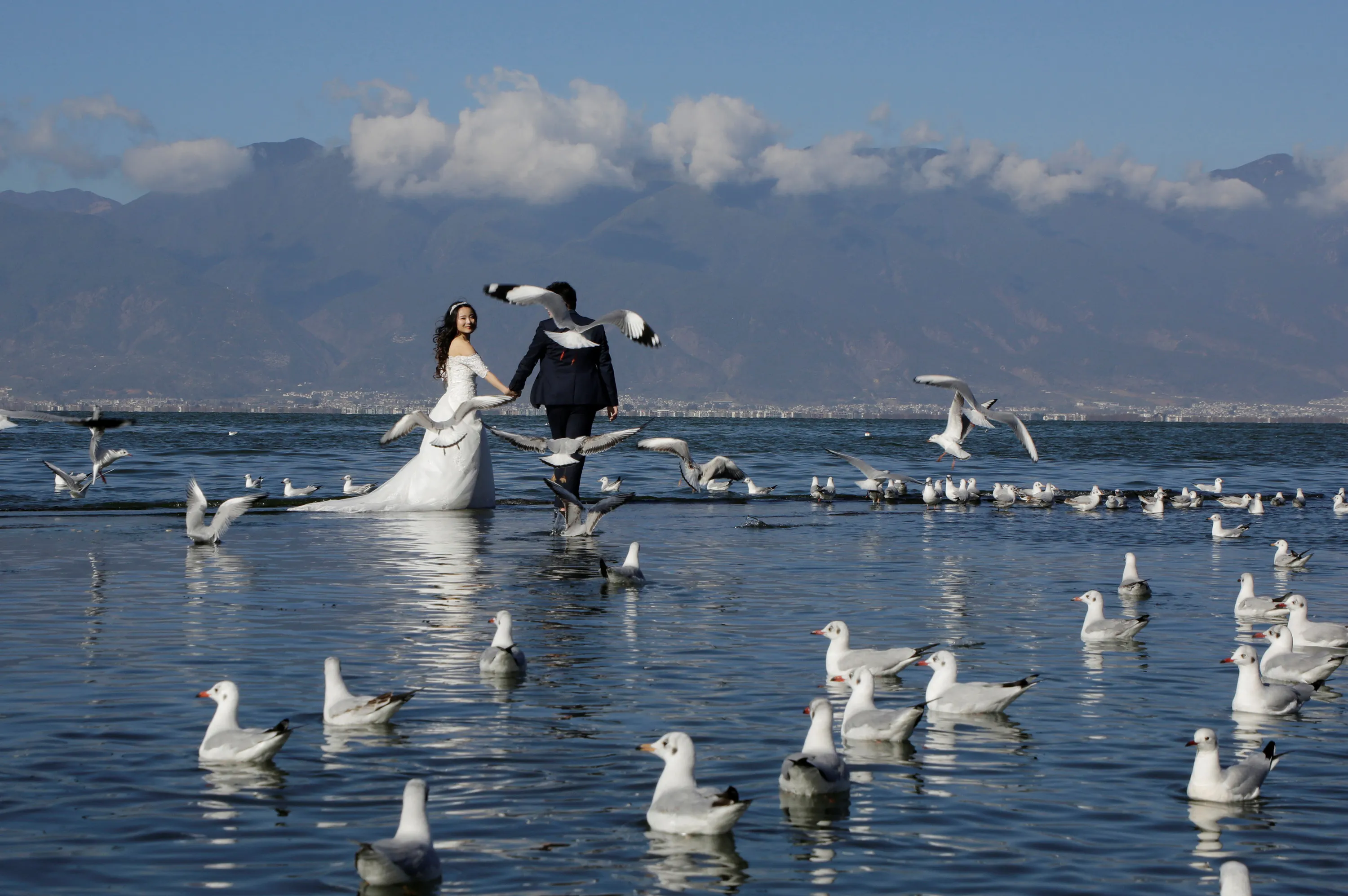 A couple pose for a wedding photo at Erhai lake in Dali, southwest China’s Yunnan province on December 28, 2016. (Photo by Jason Lee/Reuters)