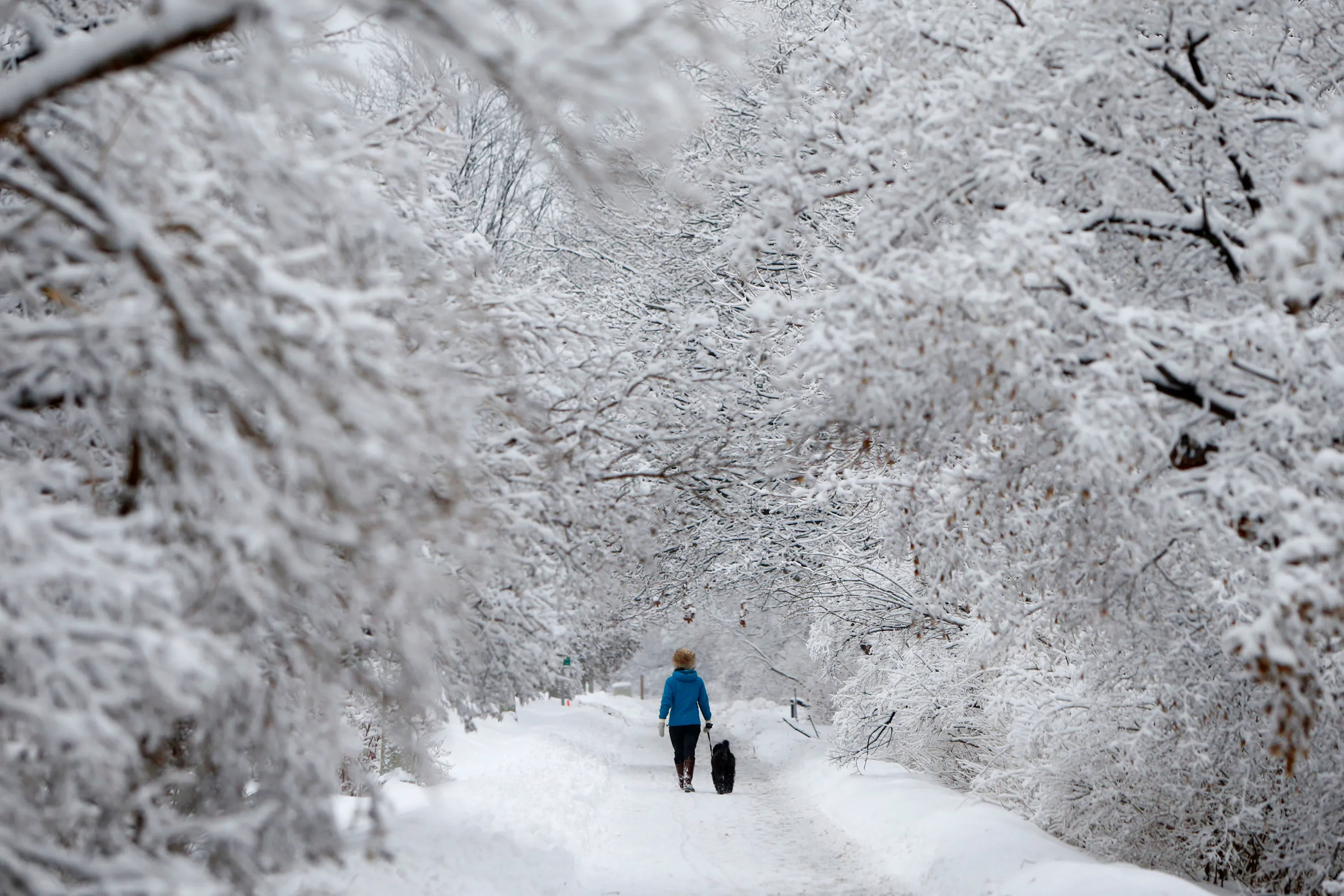A woman walks a dog on a snow-covered path beside the Rideau Canal in Ottawa, Ontario, Canada January 4, 2017. (Photo by Chris Wattie/Reuters)