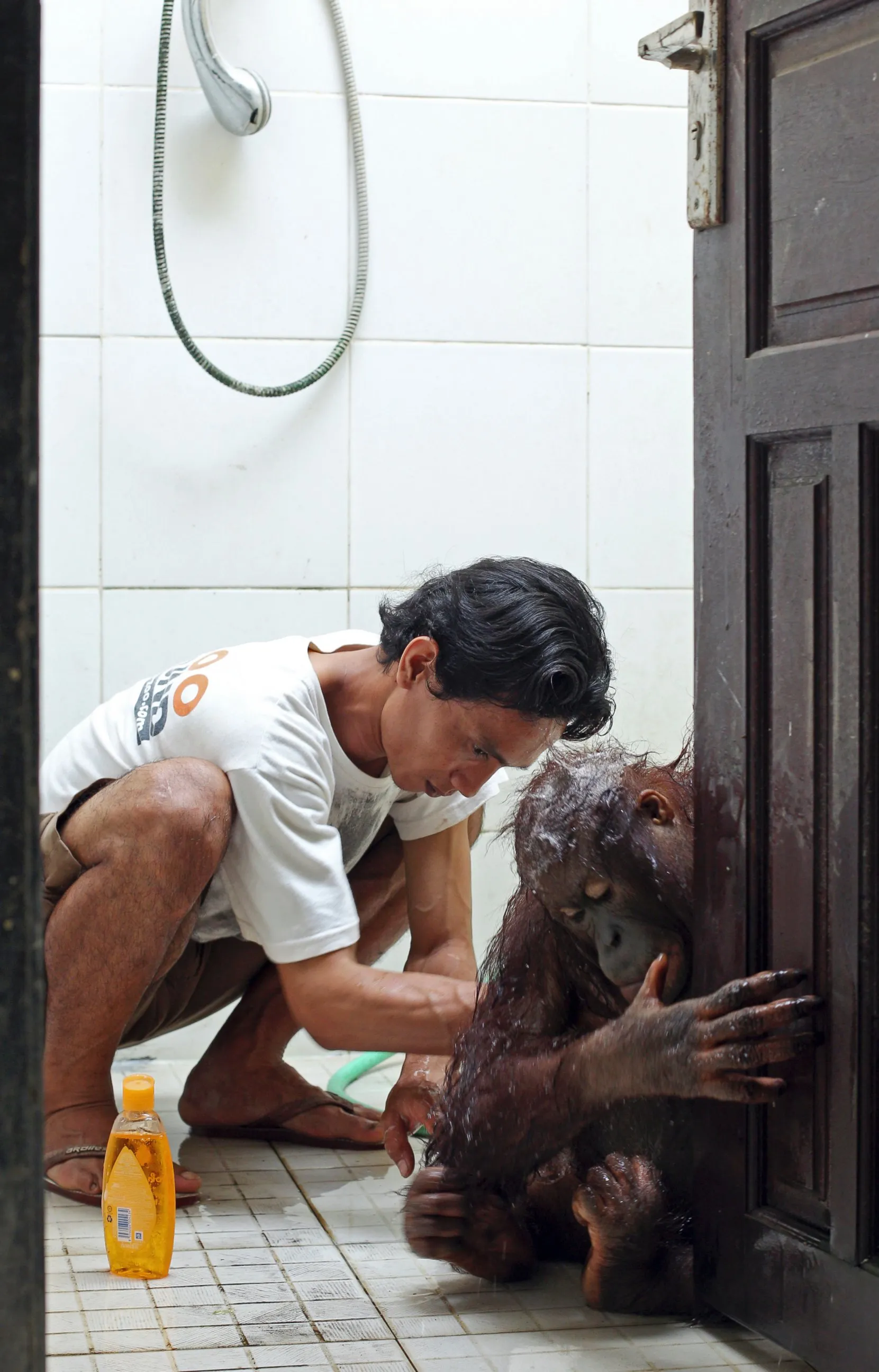 A zookeeper gives a bath to Dara, five-year-old orangutan, at the Bali Zoo in Bali, Indonesia, Monday, January 16, 2017. (Photo by Firdia Lisnawati/AP Photo)