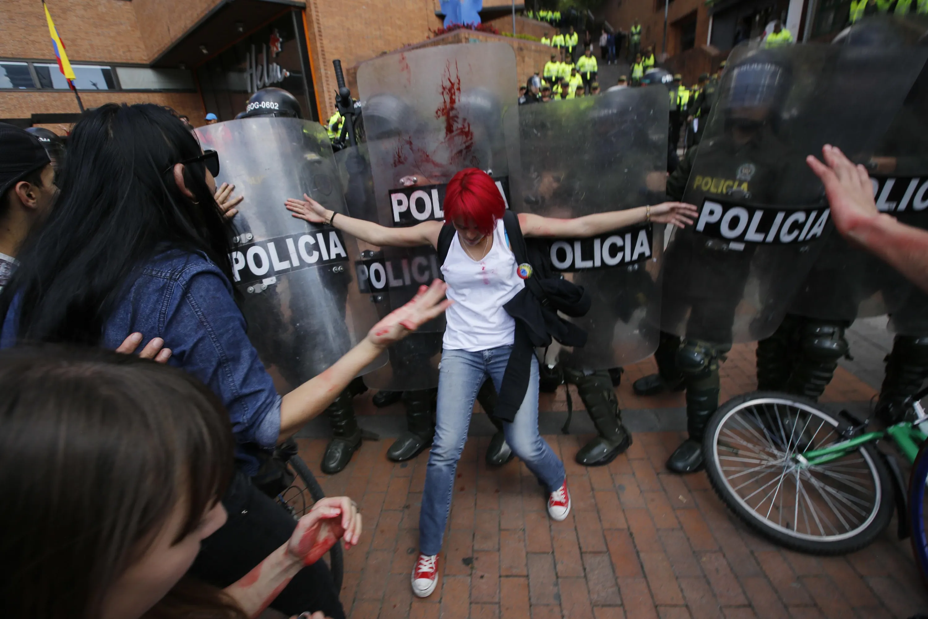 Animal defense activists challenge police ahead of a bullfight, the first such events in four years, outside the Santamaria bullring in Bogota, Colombia, Sunday, January 22, 2017 (Photo by Fernando Vergara/AP Photo)