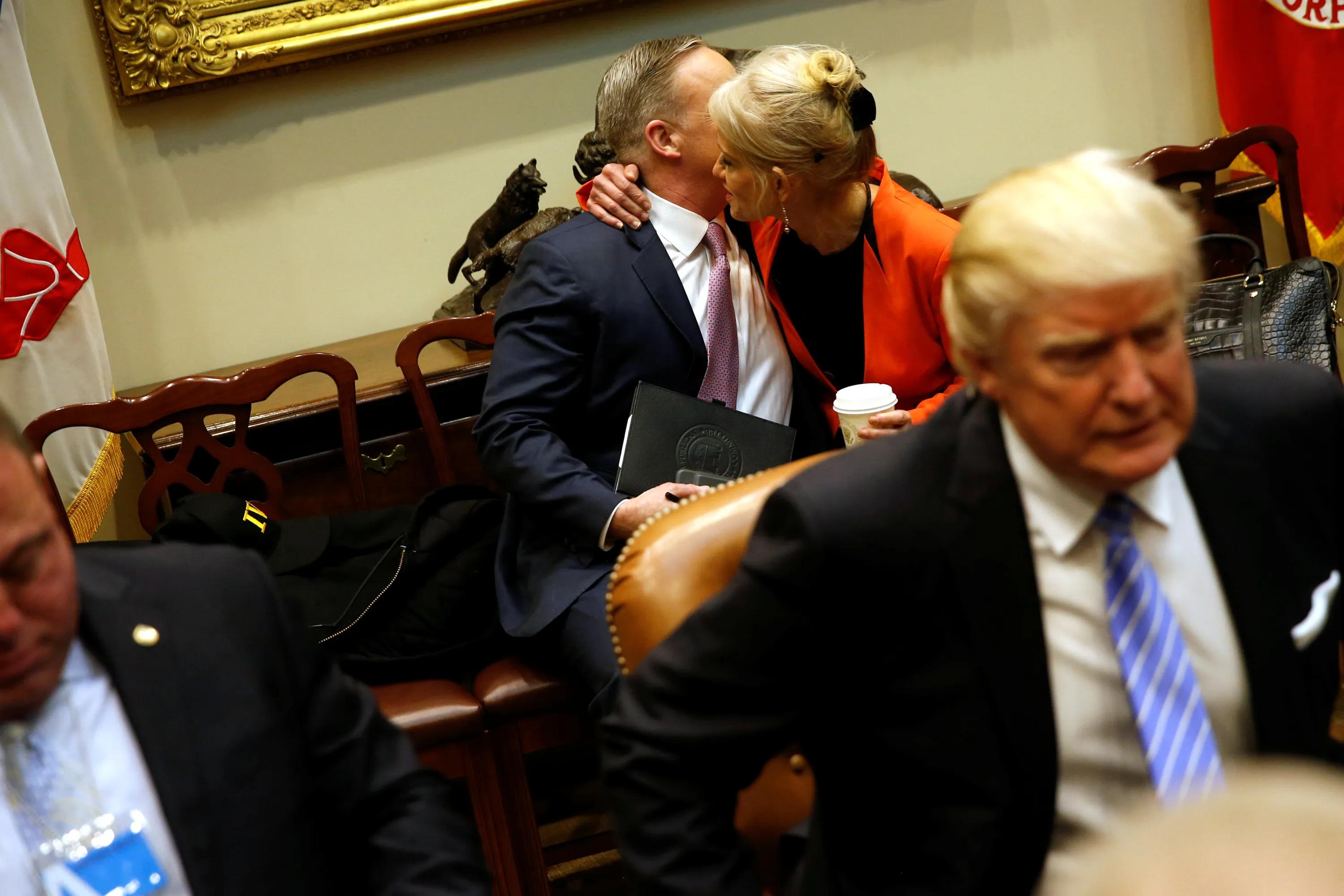 White House Senior Advisor Kellyanne Conway (2nd R) embraces Communications Director Sean Spicer as he joins a roundtable discussion between U.S. President Donald Trump and labor leaders, after Spicer's first press briefing at the White House in Washington, U.S. January 23, 2017. (Photo by Jonathan Ernst/Reuters)