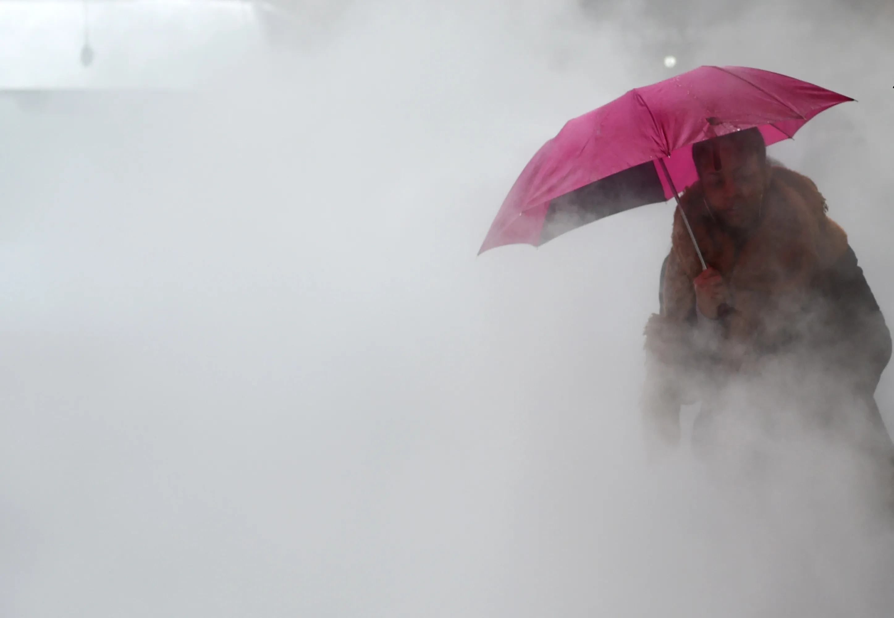 A person walks in the rain and steam coming from a sidewalk grate in Midtown Manhattan in New York January 24, 2017. The city is in the second day of the first Nor'easter of the year with Meteorologists predicting heavy rains with dangerous winds that could gust up to 70 mph, and a risk of flooding in coastal areas. (Photo by Timothy A. Clary/AFP Photo)