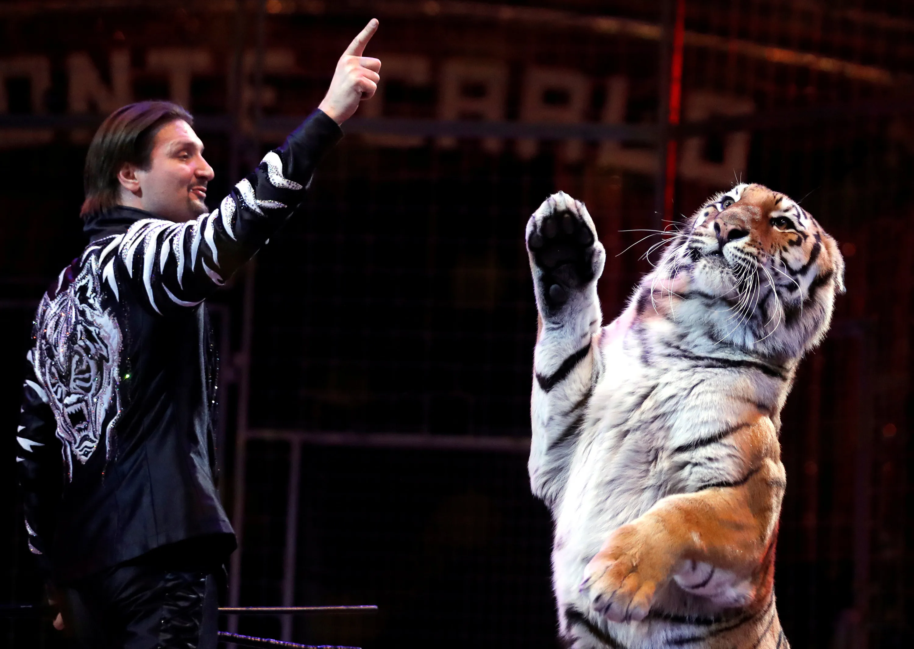 Zapashny brothers, winners of a Silver Clown award, perform with a tiger at the gala of the 41st Monte-Carlo International Circus Festival in Monaco January 24, 2017. (Photo by Eric Gaillard/Reuters)