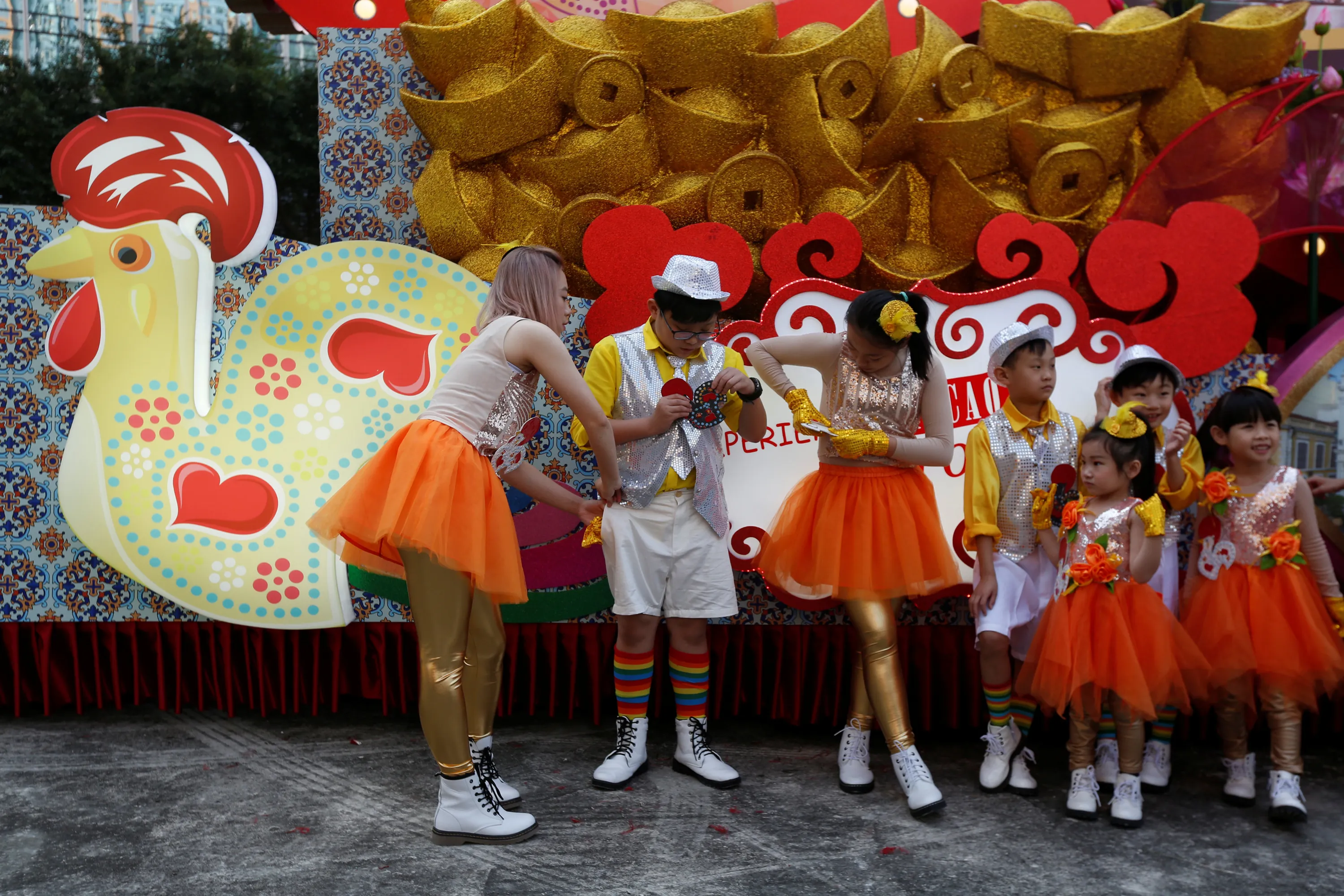 Dancers take part in the upcoming Chinese New Year parade preparing for the rehearsal beside a float from Macau Tourism Office, in Hong Kong, China January 25, 2017. (Photo by Bobby Yip/Reuters)