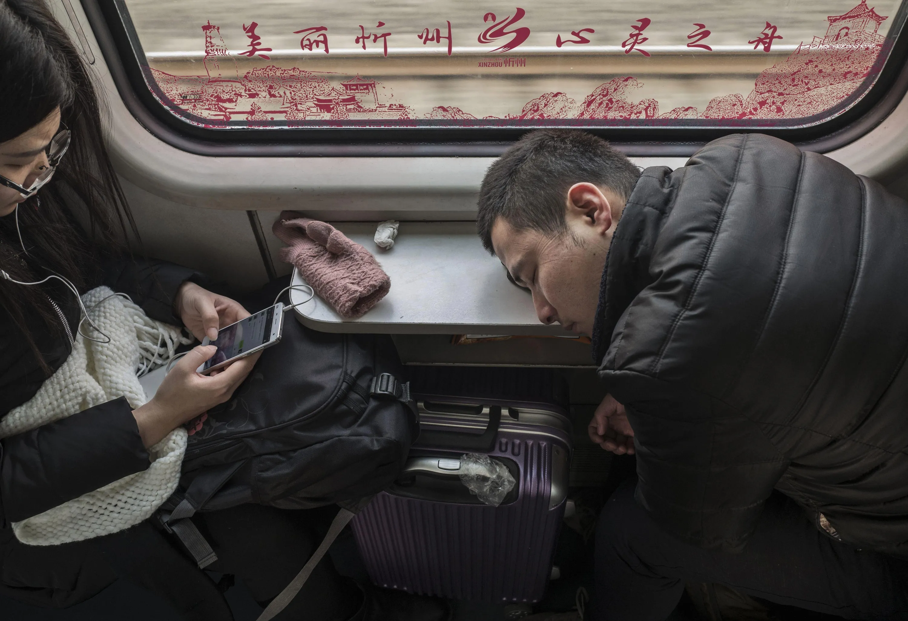 A Chinese traveler sleeps on a train between Beijing and Shijiazhuang on January 25, 2017 in Hebei province, northern China. (Photo by Kevin Frayer/Getty Images)
