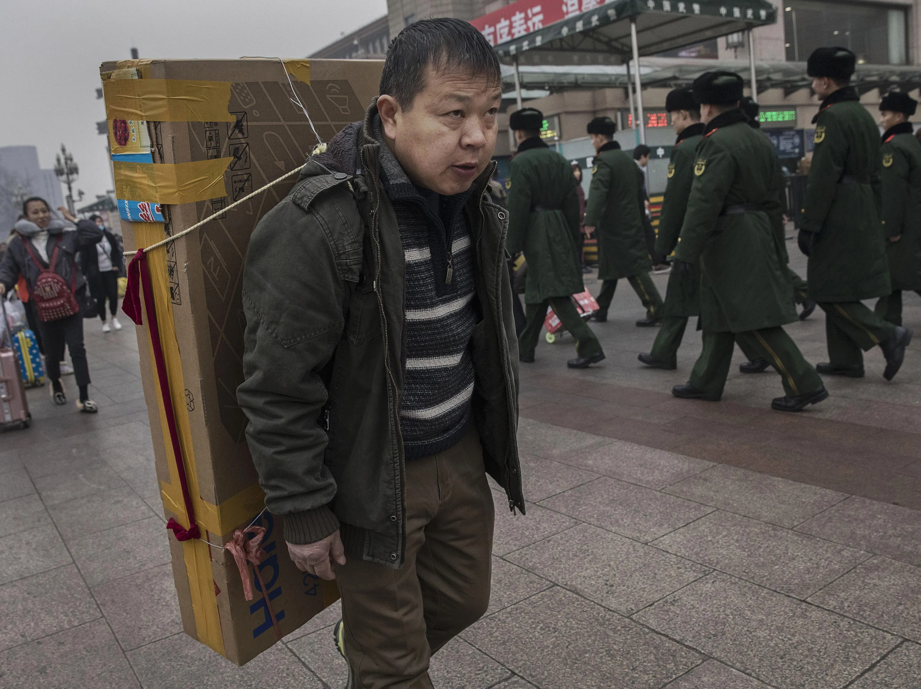 A Chinese carries a television set on his back as he arrives to board a train at Beijing Railway Station on January 26, 2017 in Beijing, China. (Photo by Kevin Frayer/Getty Images)