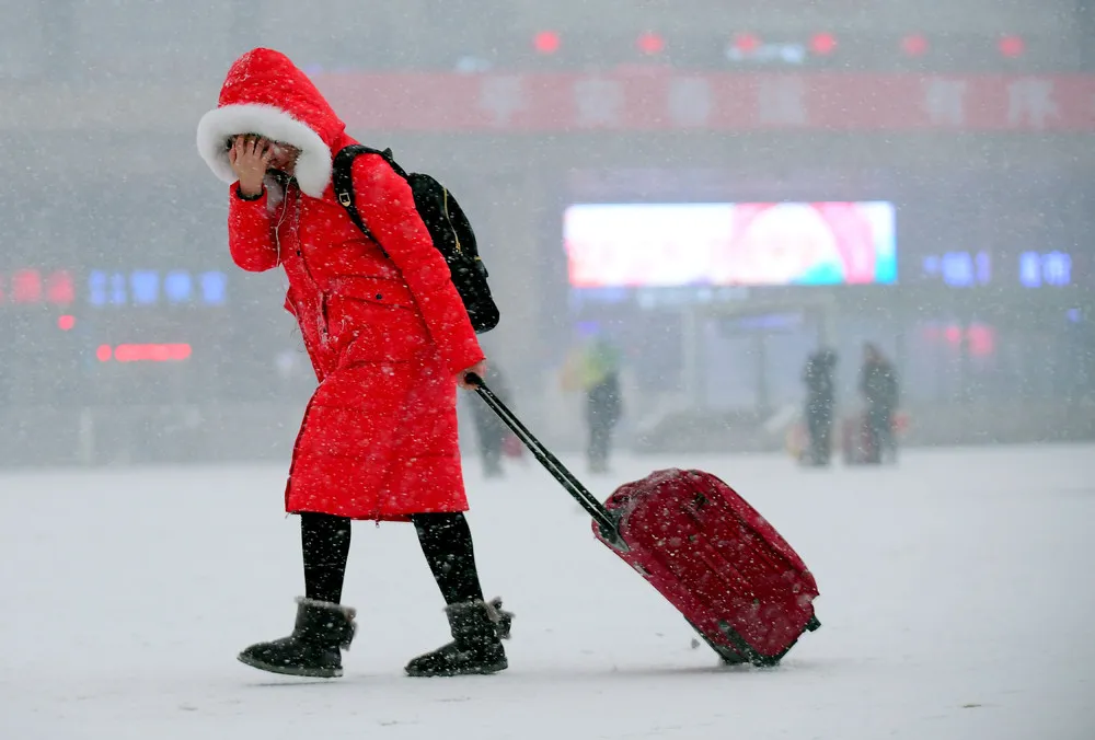 A passenger carries her luggage as she walks in the snow at a railway station in Shenyang, Liaoning province, China January 26, 2017. (Photo by Reuters/Stringer)
