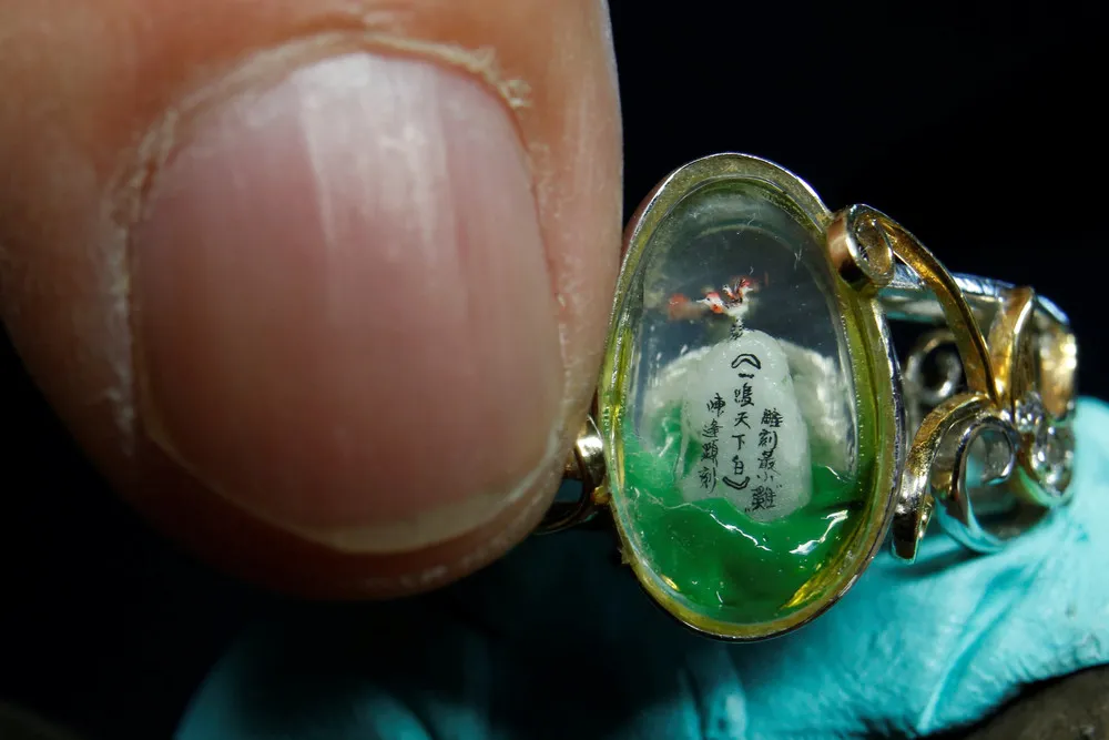 A 1 mm long (0.03 inches) miniature resin figurine of a rooster, is seen inside a ring, created by Taiwanese artist Chen Forng-Shean, ahead of Chinese New Year in New Taipei City, Taiwan January 24, 2017. (Photo by Tyrone Siu/Reuters)