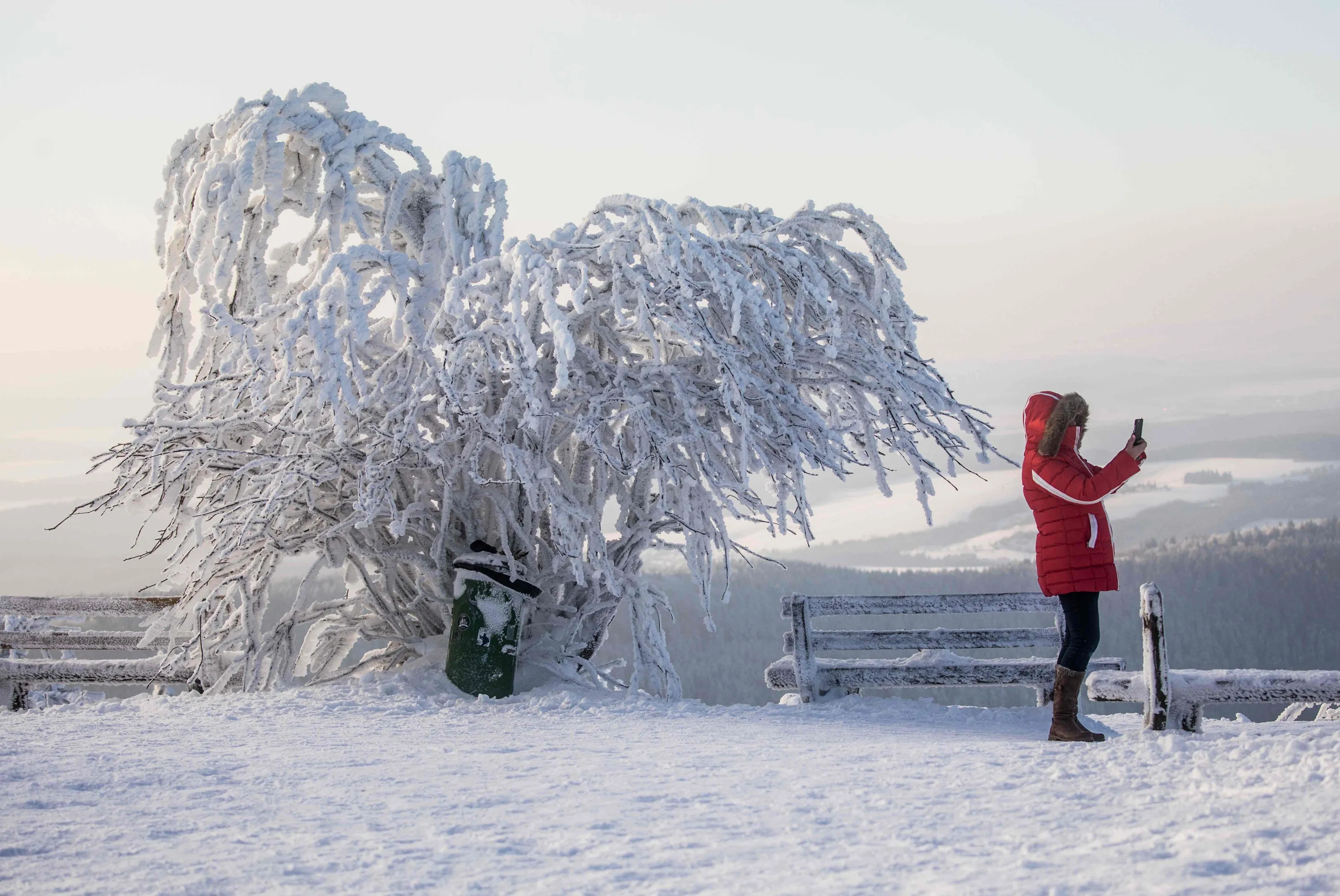 A woman takes a selfie in the winter landscape at the top of Grosser Feldberg mountain in the Taunus mountain range, Germany, 16 January 2017. (Photo by Frank Rumpenhorst/DPA)