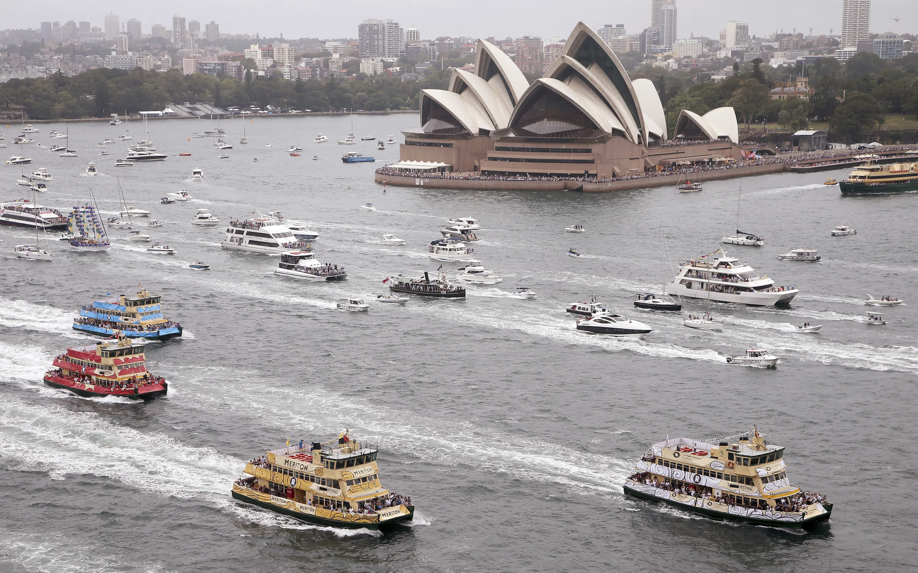 Competitors in the annual ferry boat race are supported by a spectator flotilla as they cruise past the Sydney Opera House as part of Australia Day celebrations in Sydney, Thursday, January 26, 2017. (Photo by Rick Rycroft/AP Photo)