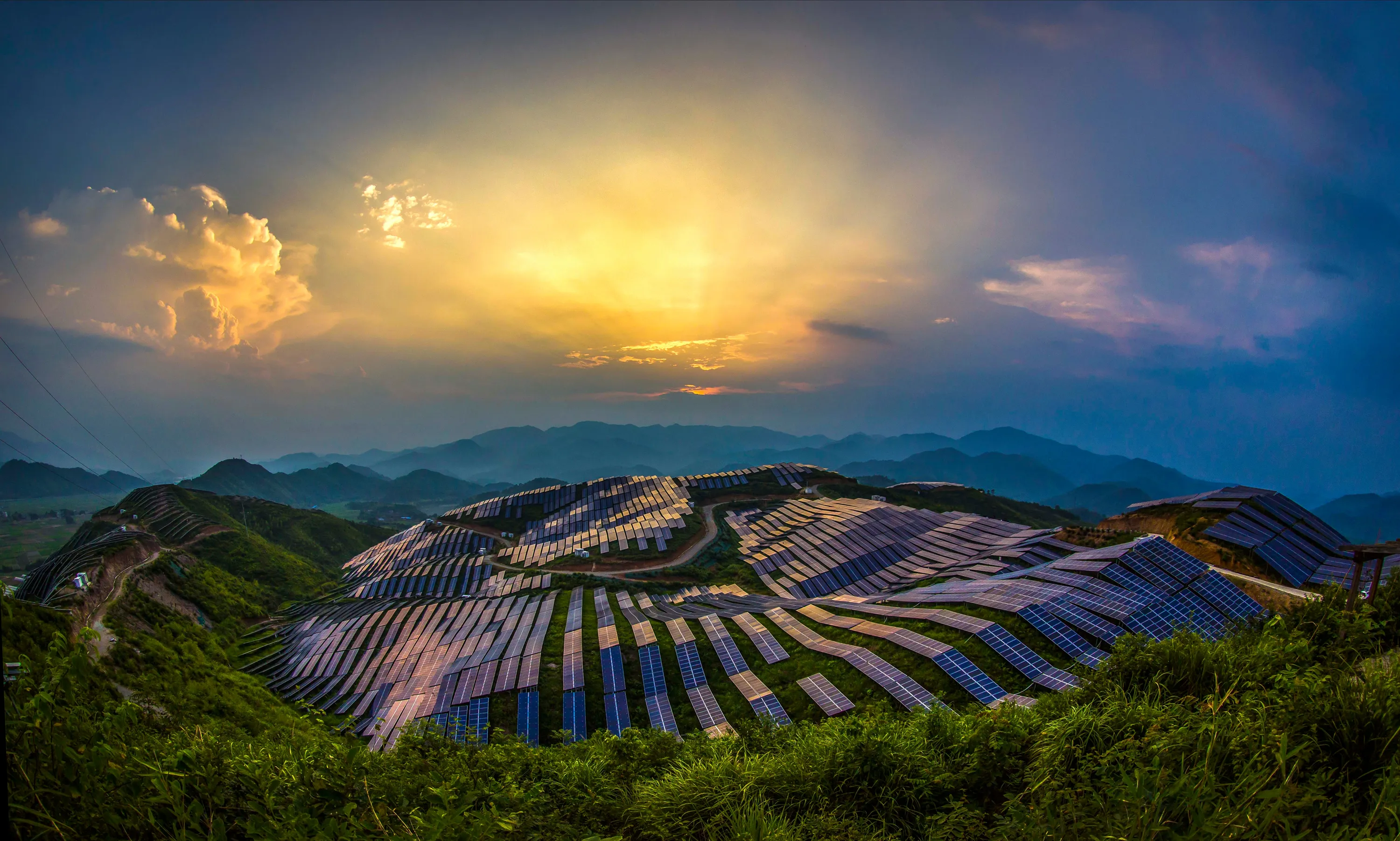 The sun sets over a photovoltaic solar power station in Songxi, China on August 24, 2016. (Photo by Feature China/Barcroft Images)
