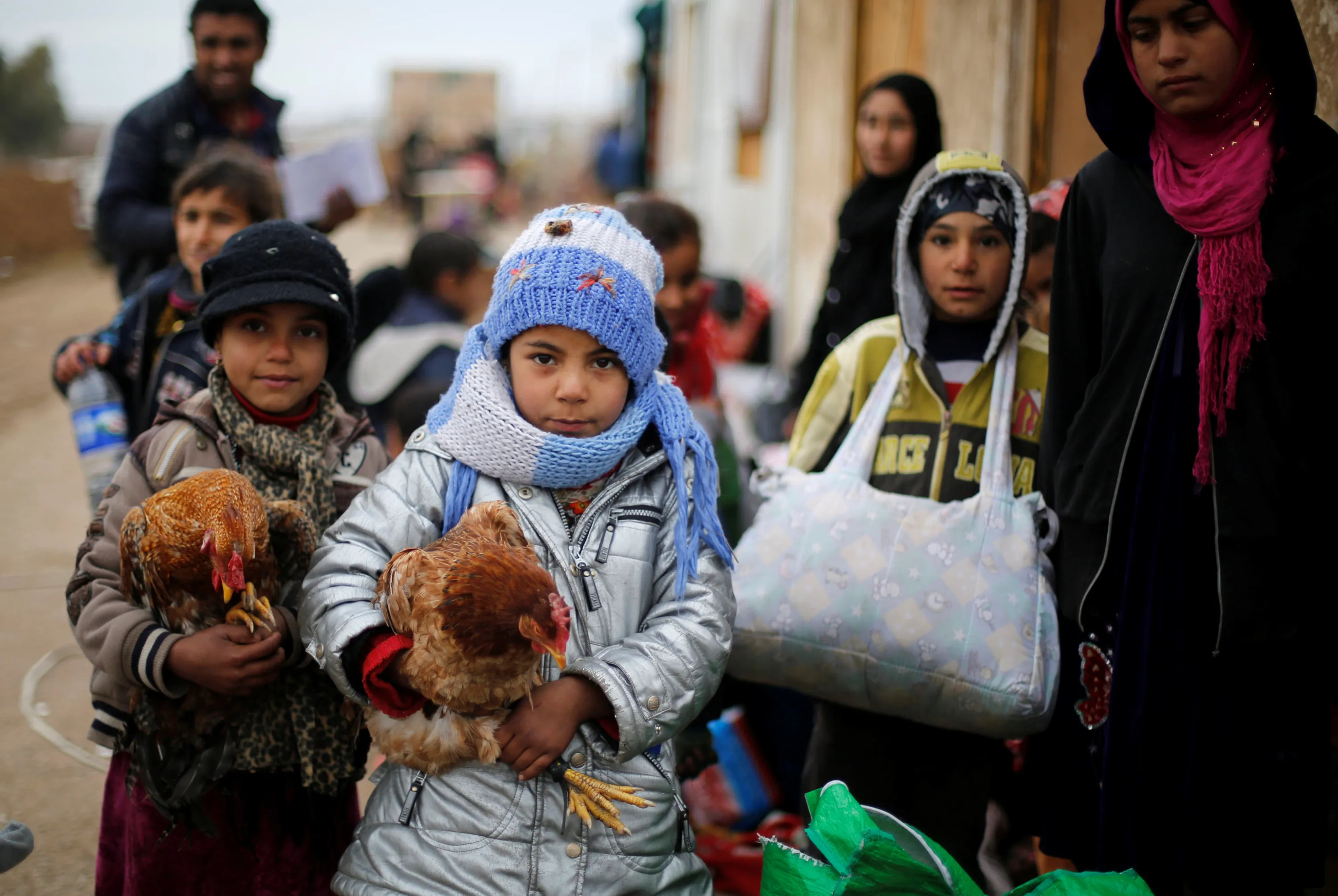 Displaced children who fled the Islamic State stronghold of the Arabi neighborhood, north of Mosul with their families carry their chickens as they wait to register their names at a military checkpoint before being transported to the camps in the east of Mosul, Iraq, January 25, 2017. (Photo by Muhammad Hamed/Reuters)