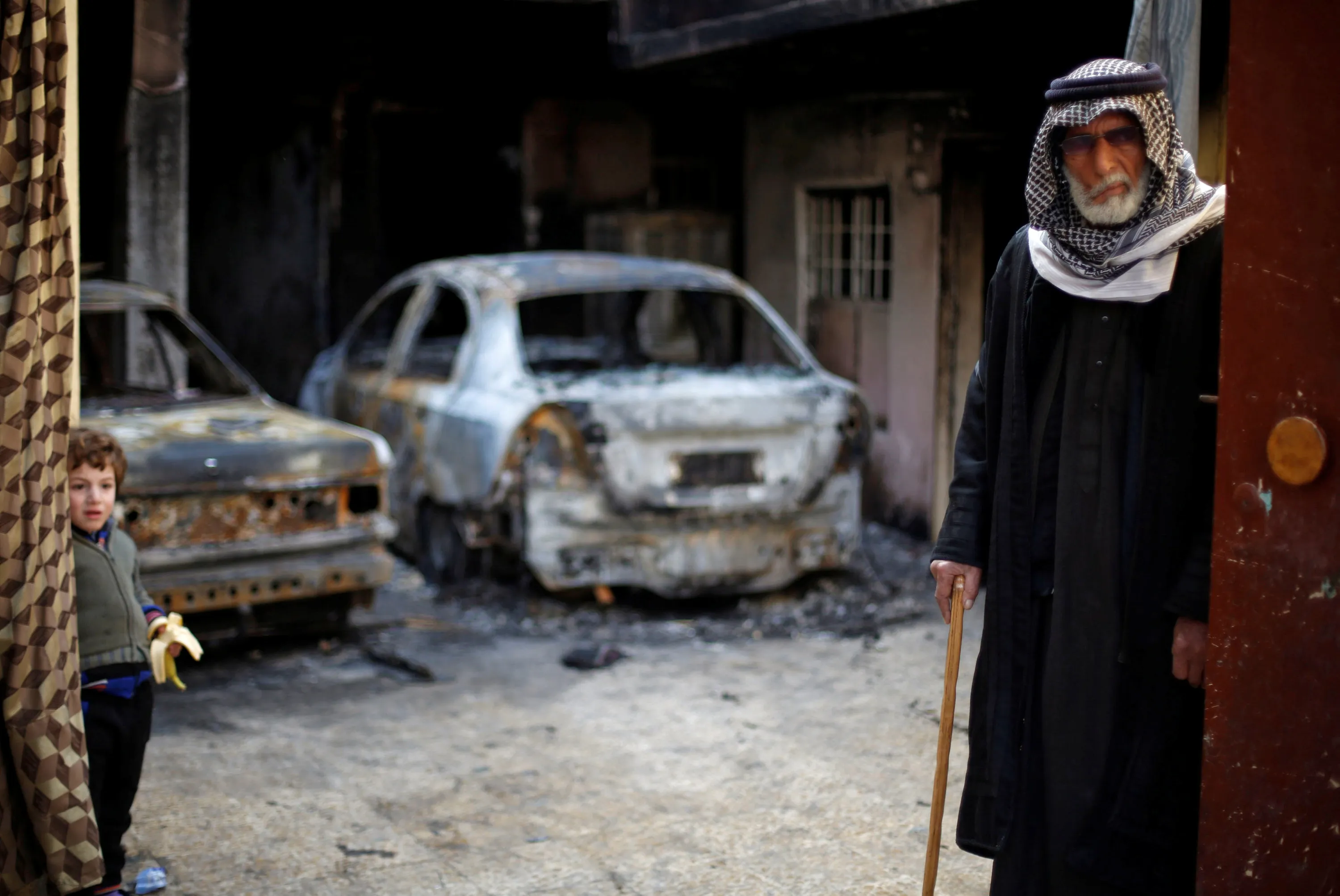 A man and a child stand in front of a house which was burned by Islamic State militants before they fled the area, in the Arabi neighborhood in Mosul, Iraq January 26, 2017. (Photo by Muhammad Hamed/Reuters)