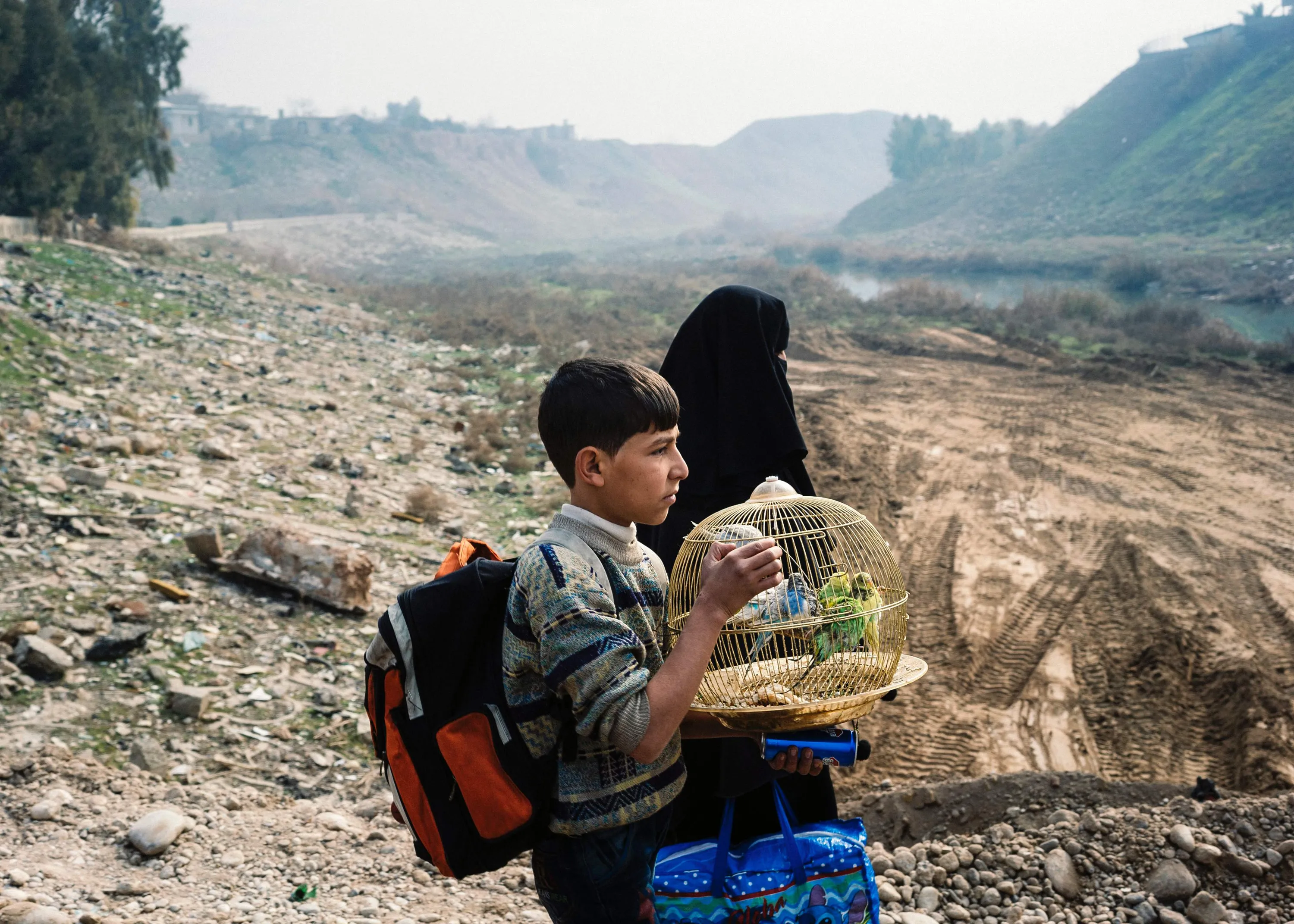 An Iraqi boy carries a cage with songbirds as he walks on a makeshift river crossing next to a bridge which was destroyed by Islamic State (IS) group fighters in Mosul' s al- Sukkar neighbourhood, during the ongoing military operation against the jihadists, on January 21, 2017 Iraqi forces battled the last holdout jihadists in east Mosul after commanders declared victory there and quickly set their sights on the city' s west, where more tough fighting awaits. (Photo by Dimitar Dilkoff//AFP Photo)