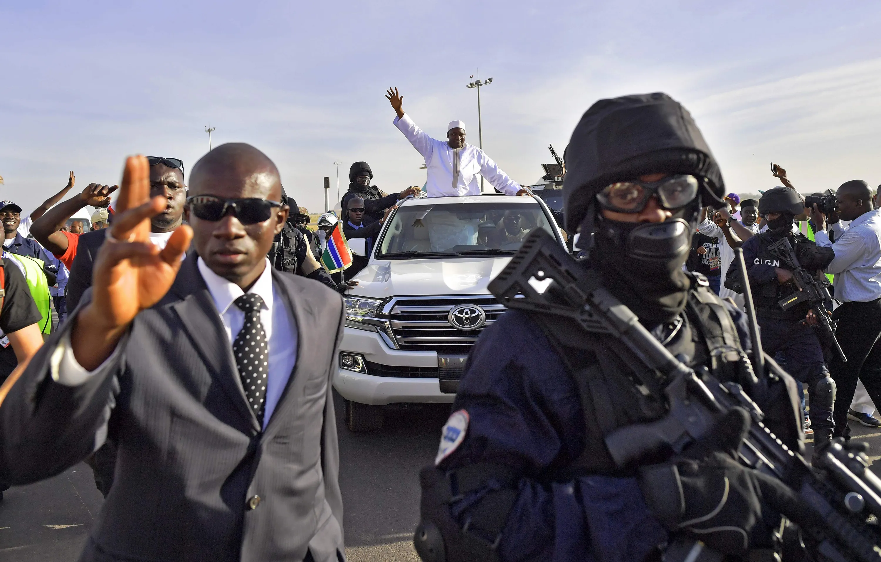 Gambia' s new president Adama Barrow (C) waves as he leaves Banjul airport on January 26, 2017 in Banjul, after returning from Senegal Jubilant Gambians on Janauary 26 welcomed home their new President Adama Barrow, who was elected almost two months ago but forced to flee to Senegal when his predecessor refused to step aside. Dressed in flowing white robes and cap, Barrow stepped off the plane, with heavily- armed troops from Senegal and Nigeria standing by as he flew in from Dakar where he had taken shelter on January 15. (Photo by Carl de Souza/AFP Photo)