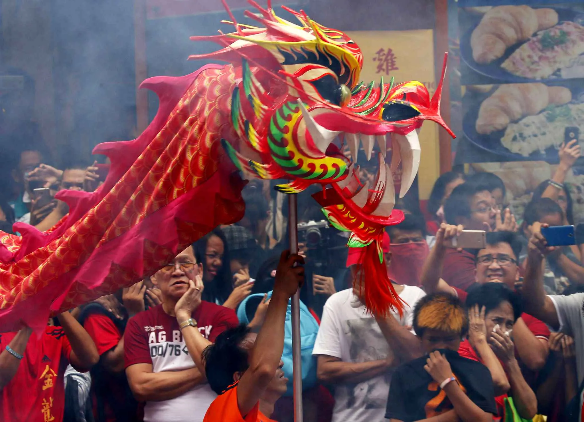 People react to the smoke of exploding firecrackers as dragon and lion dancers perform during the Chinese Lunar New Year celebrations, Saturday, January 28, 2017, in the Chinatown area of Manila, Philippines. (Photo by Bullit Marquez/AP Photo)