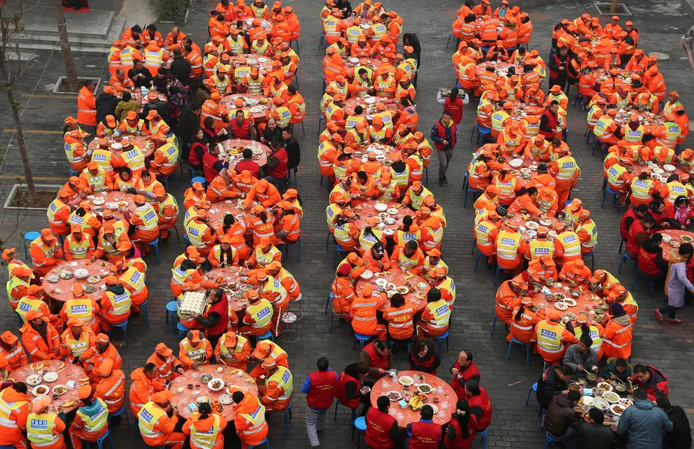 Street cleaners have meal to celebrate the upcoming Spring Festival in Xi'an, Shaaxin province, China January 24, 2017. (Photo by Reuters/Stringer)
