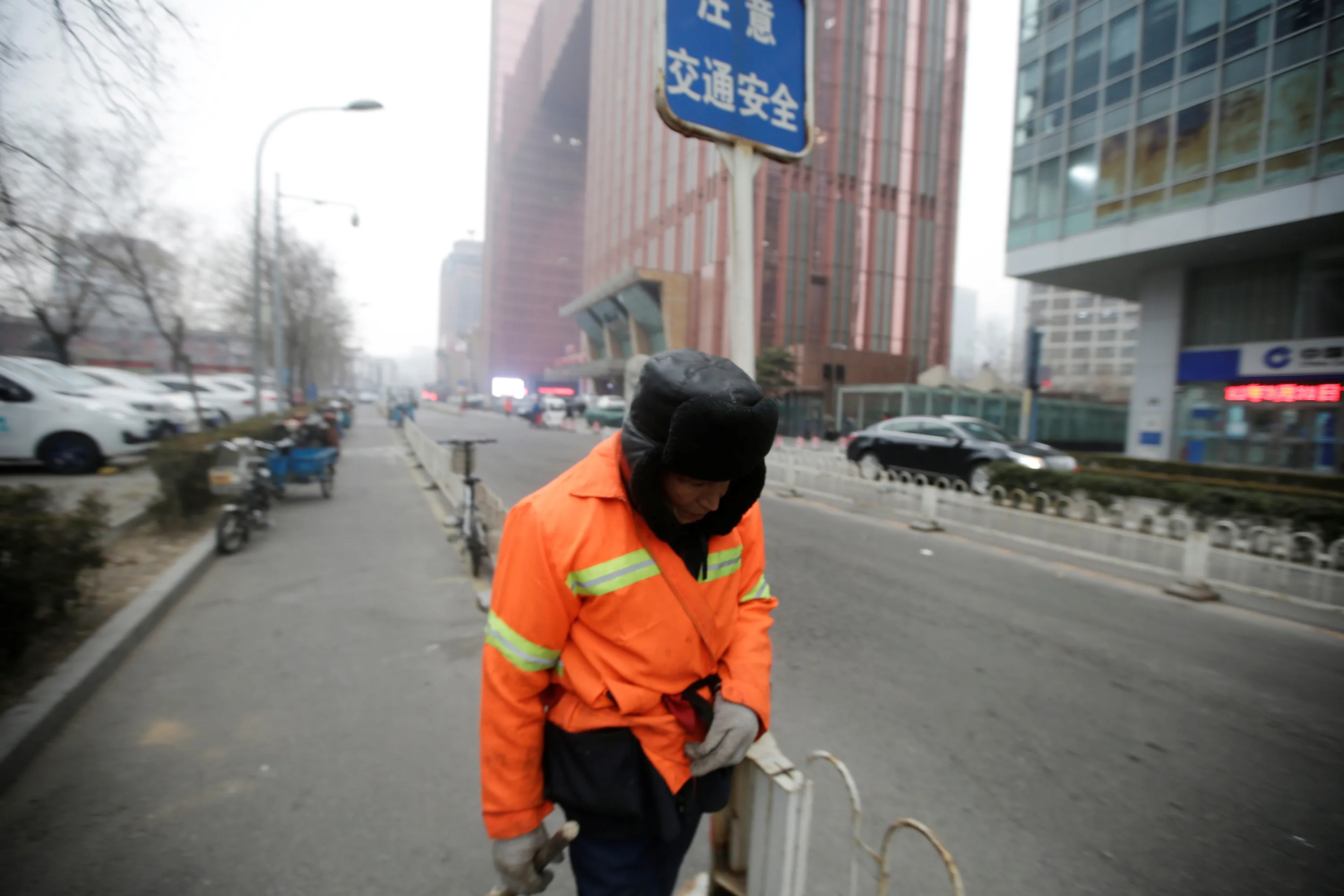 A cleaner walks along a street in Beijing's central business area, China, January 17, 2017. (Photo by Jason Lee/Reuters)