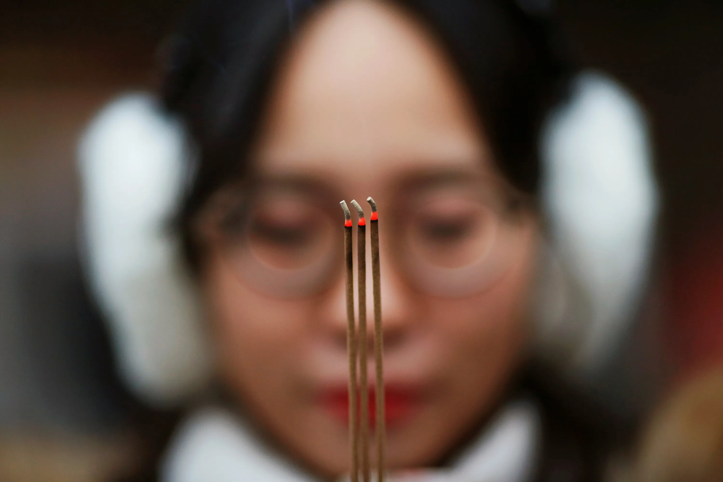 A woman holds incense sticks while praying at Yonghegong Lama Temple on the first day of the Lunar New Year of the Rooster in Beijing, China January 28, 2017. (Photo by Damir Sagolj/Reuters)